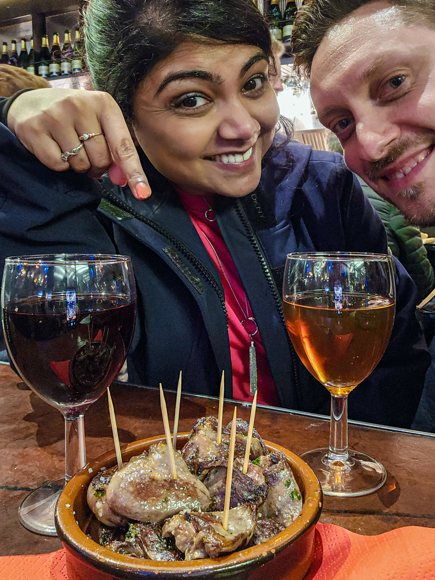 All of this eating is making us thirsty again, so we sample some Spanish wine and sherry at Tapa del Toro, and finish our food journey off with some duck hearts from Ma Poule.