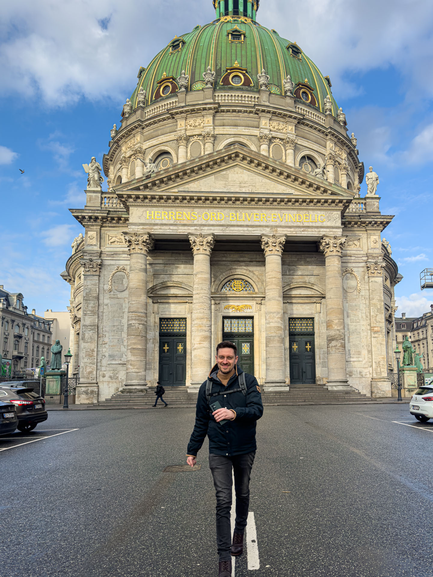 We make a quick stop at Frederiks Kirke (The Marble Church), Amalienborg Palace, and Christiansborg Palace for some photos on our walk.