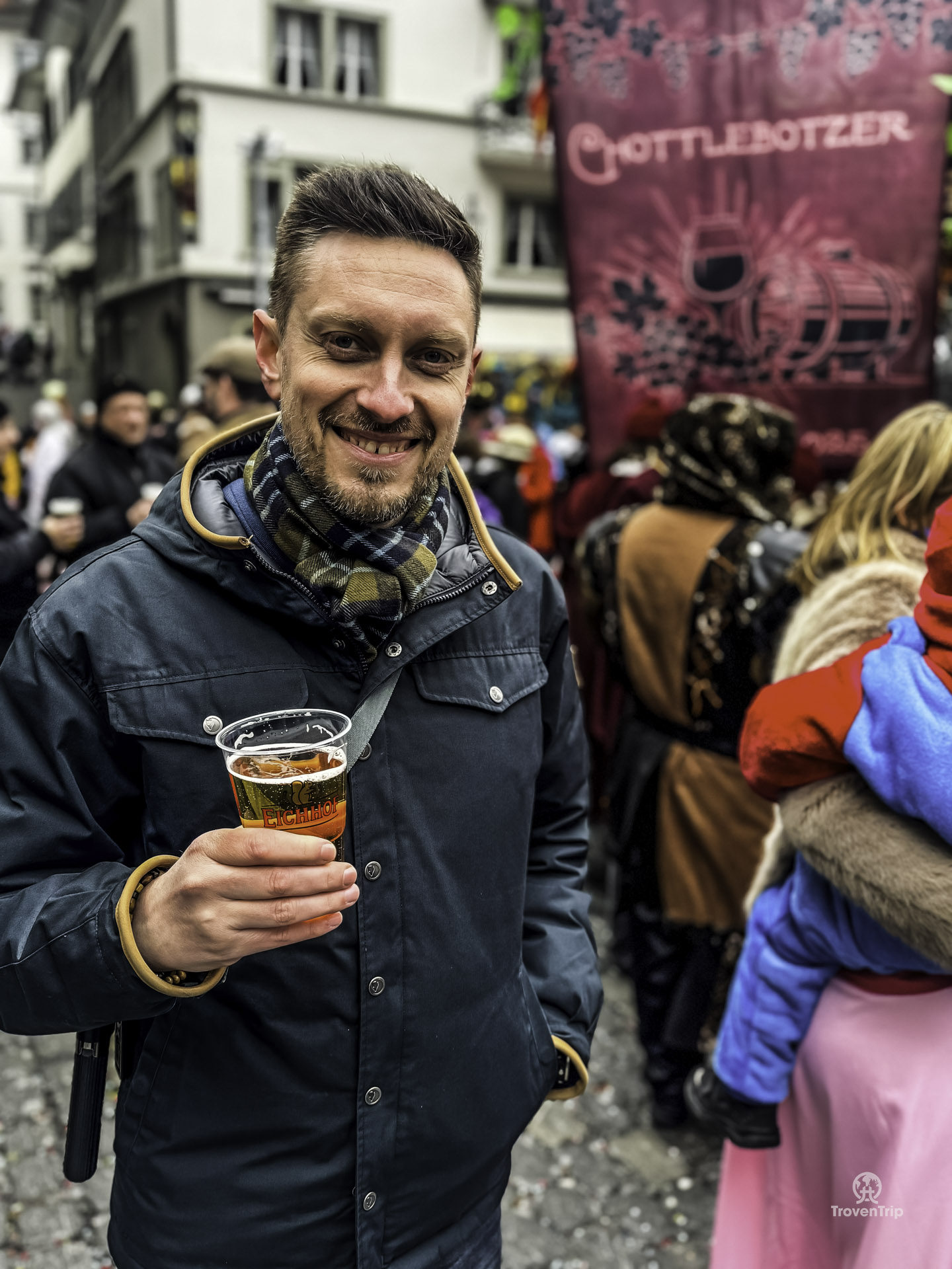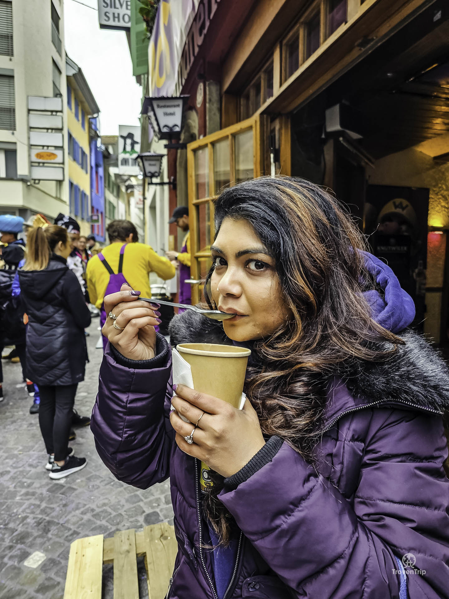 We still do some sight-seeing… the famous Chapel Bridge, Lion Monument, St. Leodegar Church, and the Old Town and Lake. But today it’s all about the carnival, so we head back into town and try the street food and drinks… a meatball soup type thing, a Cervelat sausage (pork and beef mix), and some Glühgin and beers… awesome!