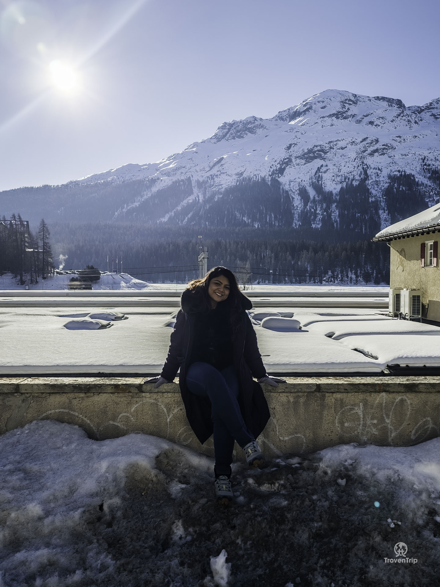 Arriving in St Moritz we have just over half an hour before the Glacier Express leaves. The station is right on the edge of Lake St. Moritz so we go to take a look… but can’t see the lake at all! It takes us a minute to realise that the huge snowy expanse in front of us is the lake! It’s -12°C and the lake has completely frozen over!