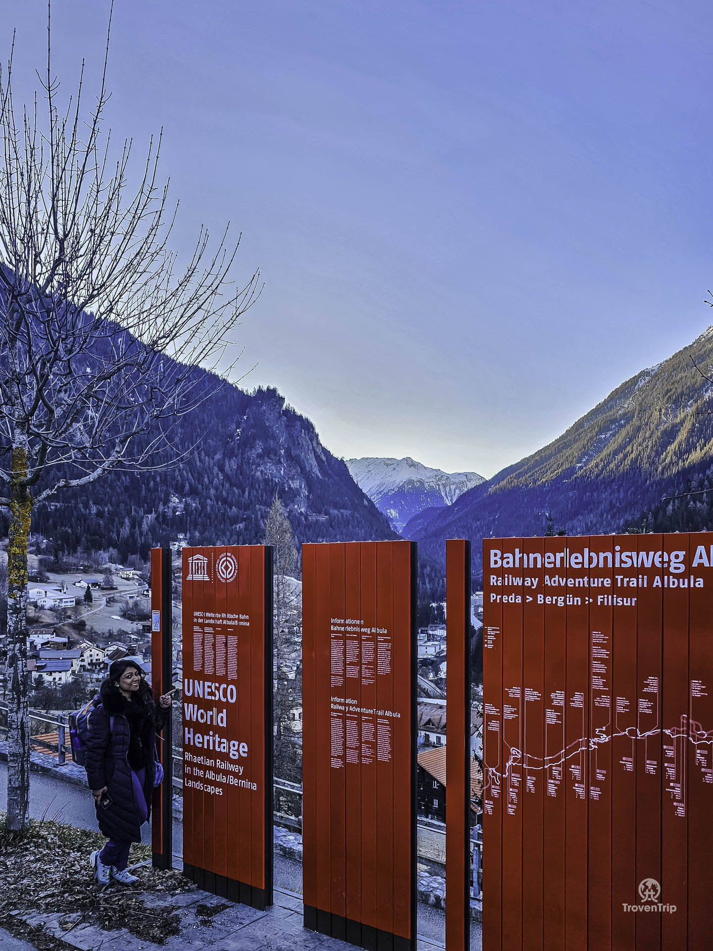 It was completely dark when we arrived in Filisur last night so we couldn’t see anything, but as we walk through the village for our early morning train, we get to see the magical Alpine sunrise over the rooftops… it's absolutely beautiful!