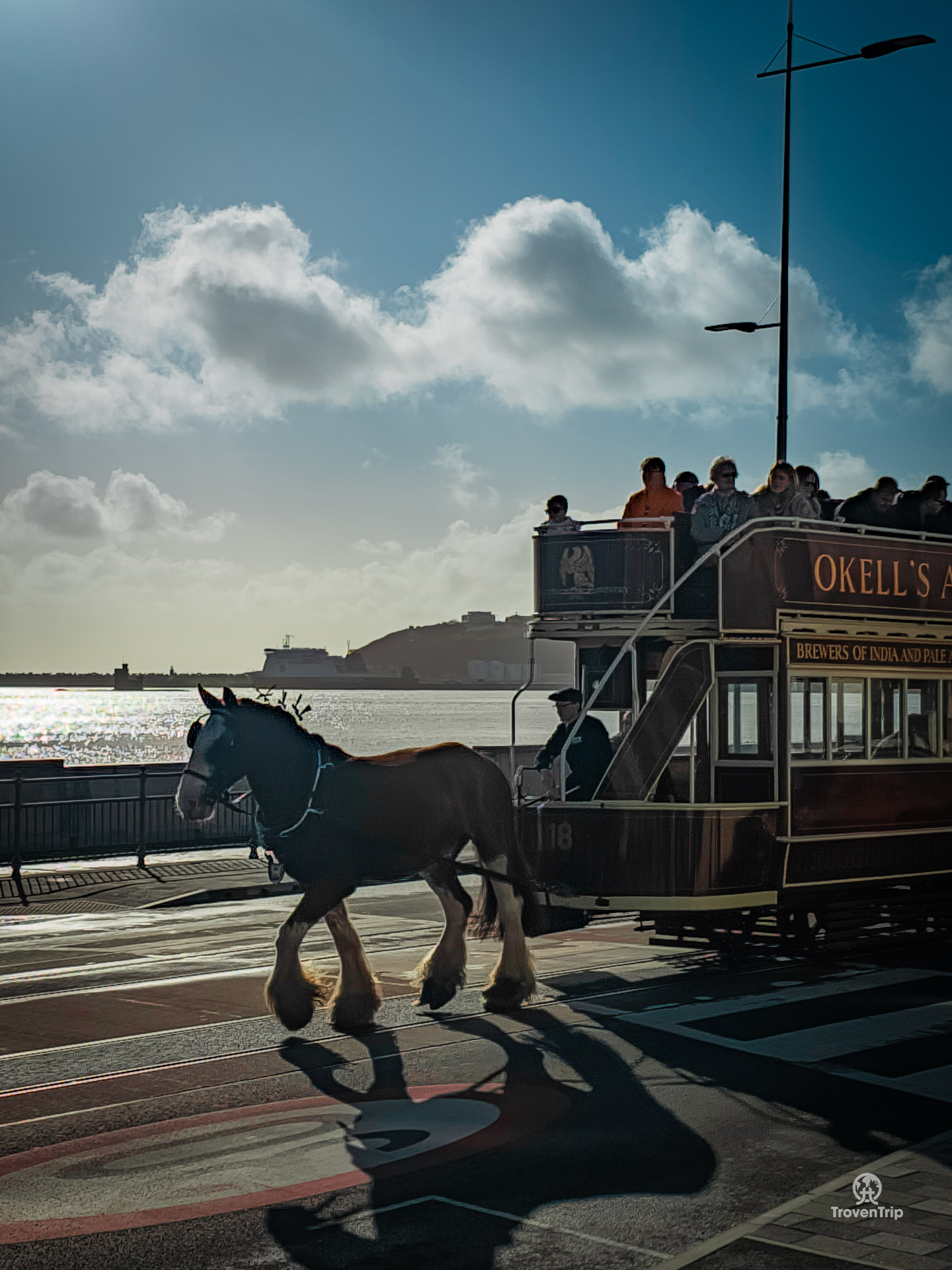 The Douglas Bay Horse Tramway is one of the last surviving Horse Tramways in the world. The tram runs between Derby Castle under the Electric Railway sign to Villa Marina outside the Gaiety Theatre, with stops along the promenade.