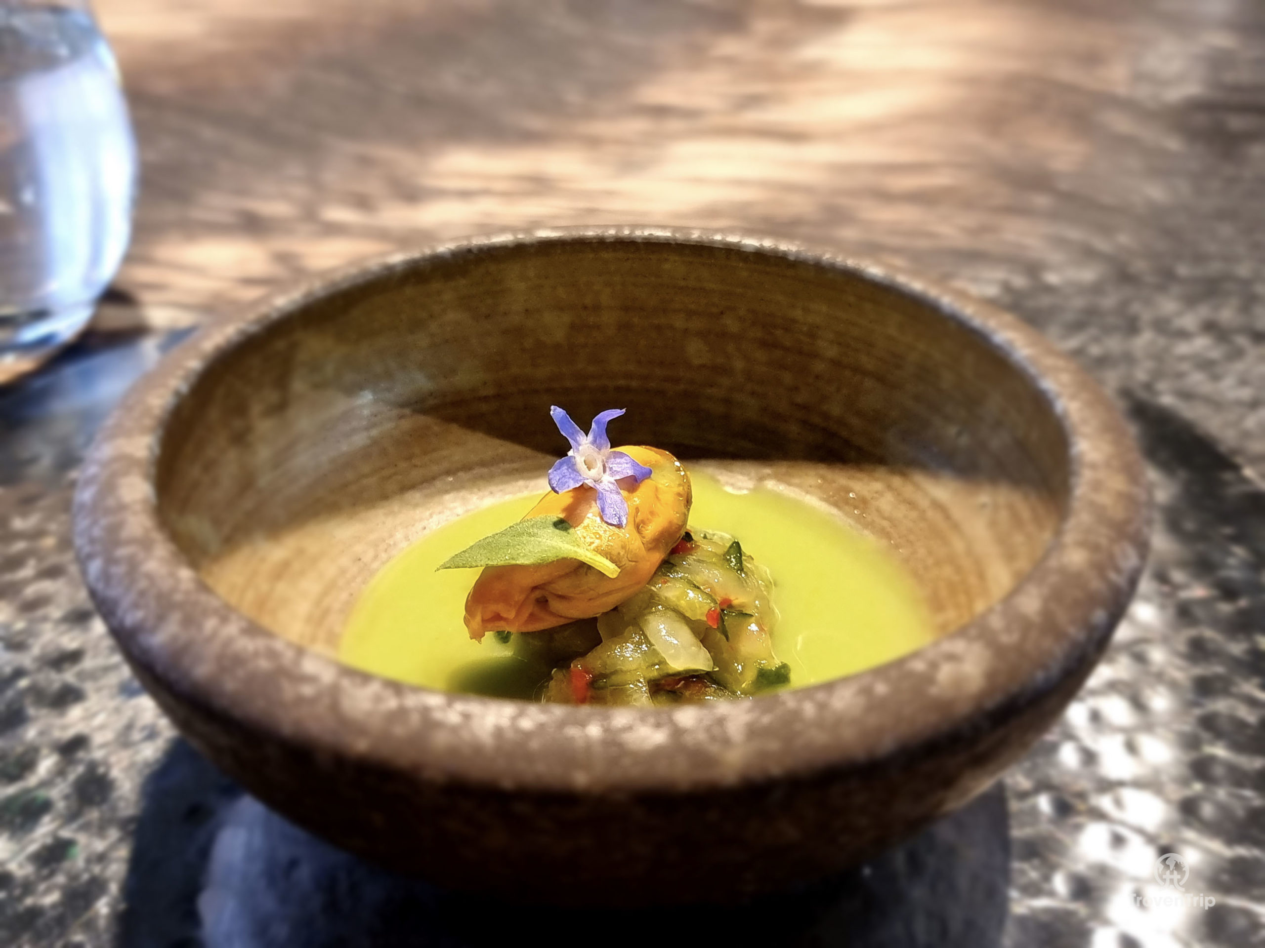 But before we even get to the menu we’re served with some pre-appetizers to start with… a Camembert and Australian truffle, beef tartare tacos, and fermented sourdough bread with sea salt butter and a baconnaise shallot spread. And they are followed by muscles on a cucumber mix with cucumber sauce, topped with a bright purple petal which makes it look really unique! (we are still thinking on how cucumber sauce can be so delicious!!)