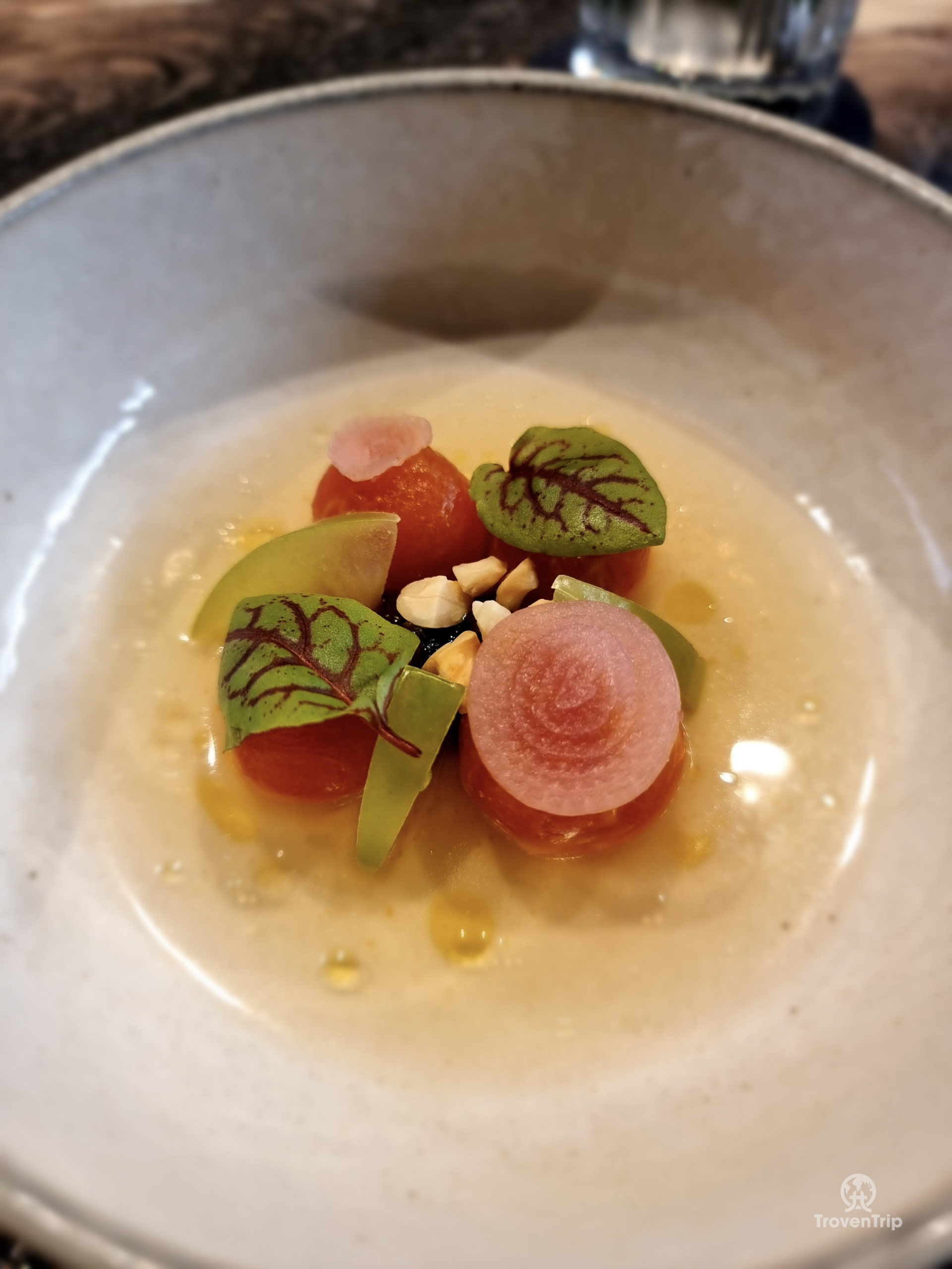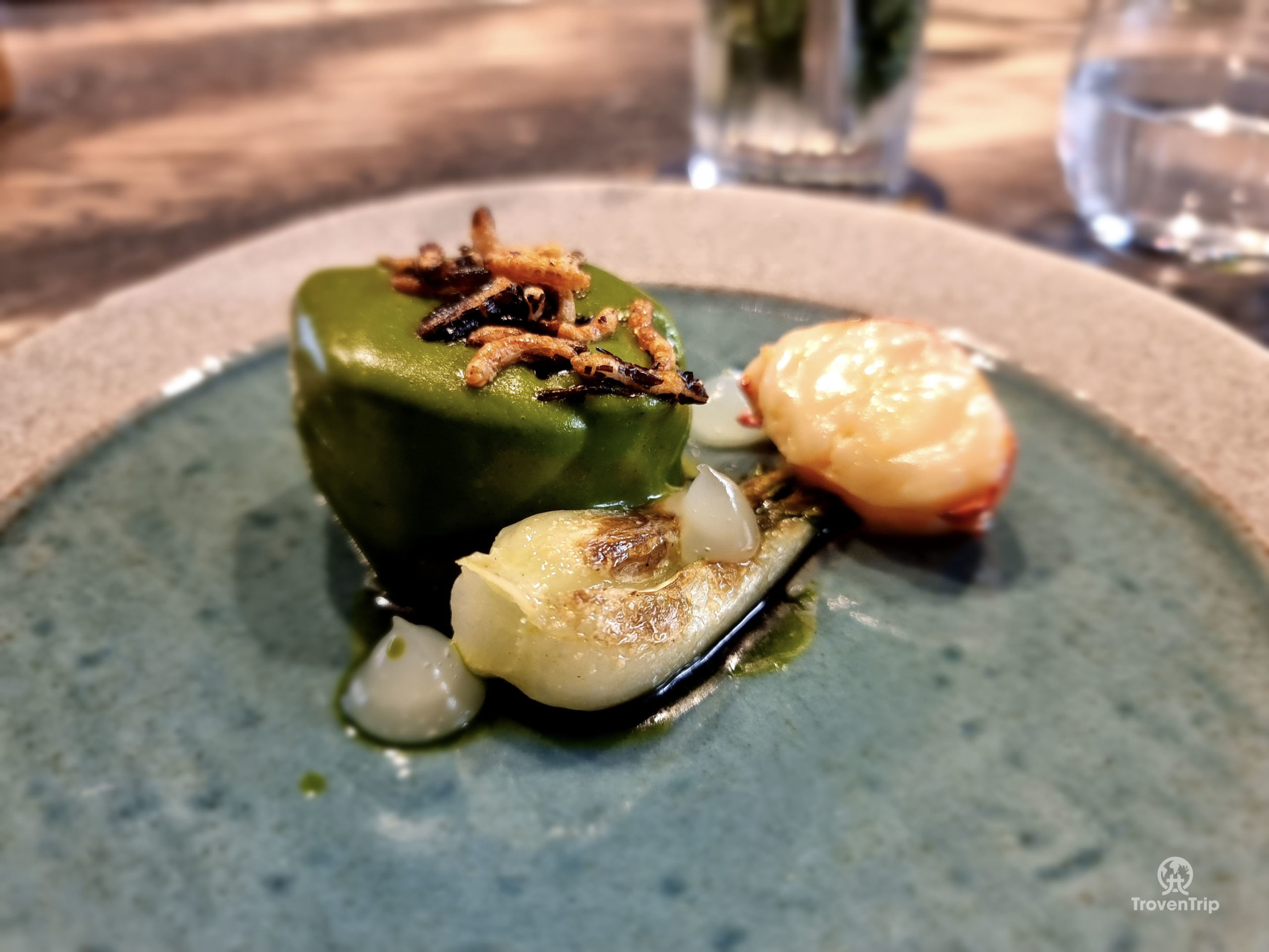 Fermented sourdough bread with sea salt butter and a baconnaise shallot spread The first starter of the tasting menu comes out, followed by the second and the starter from the à la carte lunch… and all are incredible! Cornish Mackerel with nori (dried seaweed), dashi and radish, Isle of Wight Tomato, and Veal Sweetbreads. The mackerel is soft and succulent, the veal is really flavoursome and tasty, and we don’t understand how some tomatoes and pickled shallot can taste so good?! Sneha says that she is not at all a tomato fan and still ends up eating 2 of them! To complete the starters (or are we onto the mains now?) out comes the Lightly Salted Cod and lobster, and again, delicious!