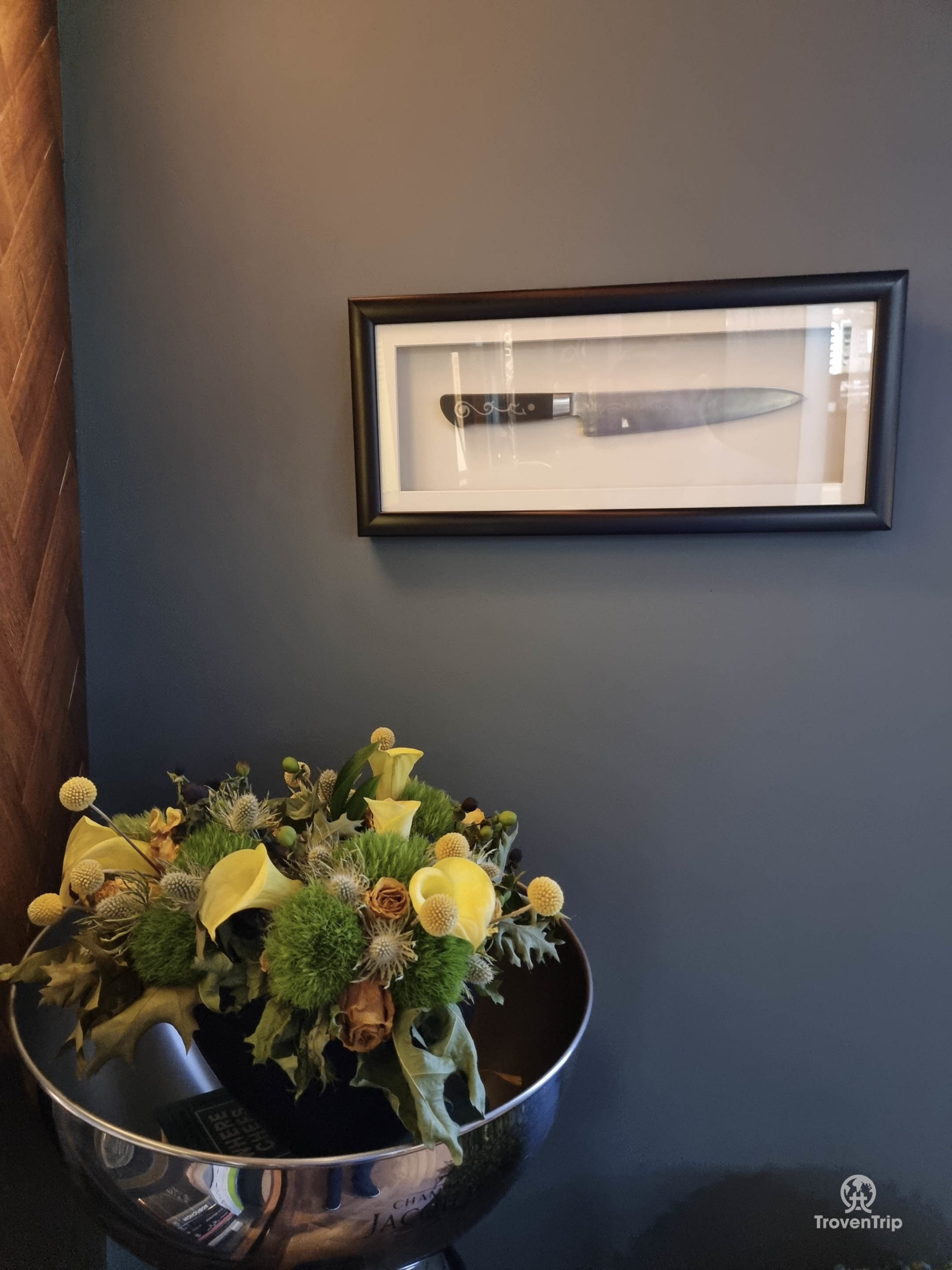 We arrive 10-minutes before our booking at 1pm and are led through the exquisite bar and restaurant areas, down some stairs, and shown to our seats at the horseshoe Chef’s Table looking into the kitchen. The restaurant in general gives both options… you can have your meal in the dining area and enjoy the delicacies, or you can enjoy the most unique Chefs table experience… sit right in front of the chefs and enjoy the artistic way in which they prepare the meals, garnish them, and make you want to try each and every dish on the menu! The work of a true artist where the kitchen is their canvas and the utensils their brush!