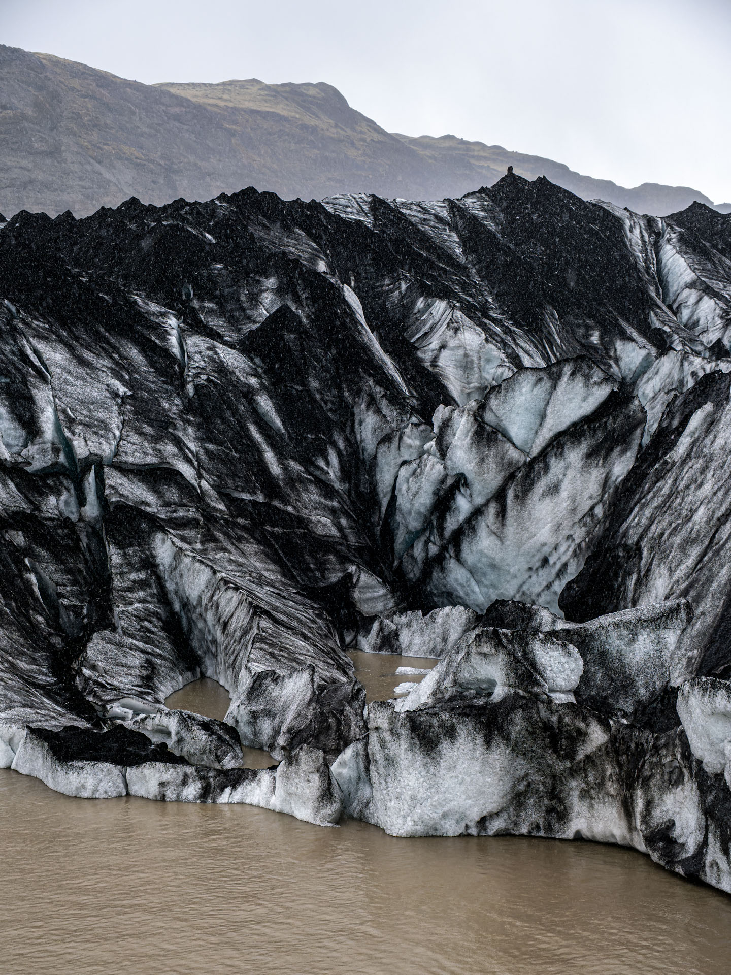 Whereas you would expect a glacier to be glistening white with the snow and ice, Sólheimajökull Glacier is speckled with black ash from the nearby Eyjafjallajökull volcanic eruption in 2010 which brought European air travel to a standstill.