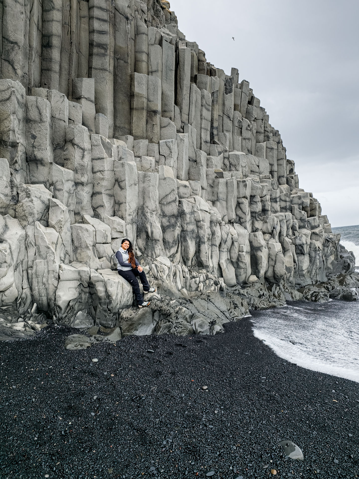 The beach truly lives up to its fame. The basalt sea columns on the cliffs add to the otherworldly feel of the beach, and we climb up them and sit for a while watching the rough sea.