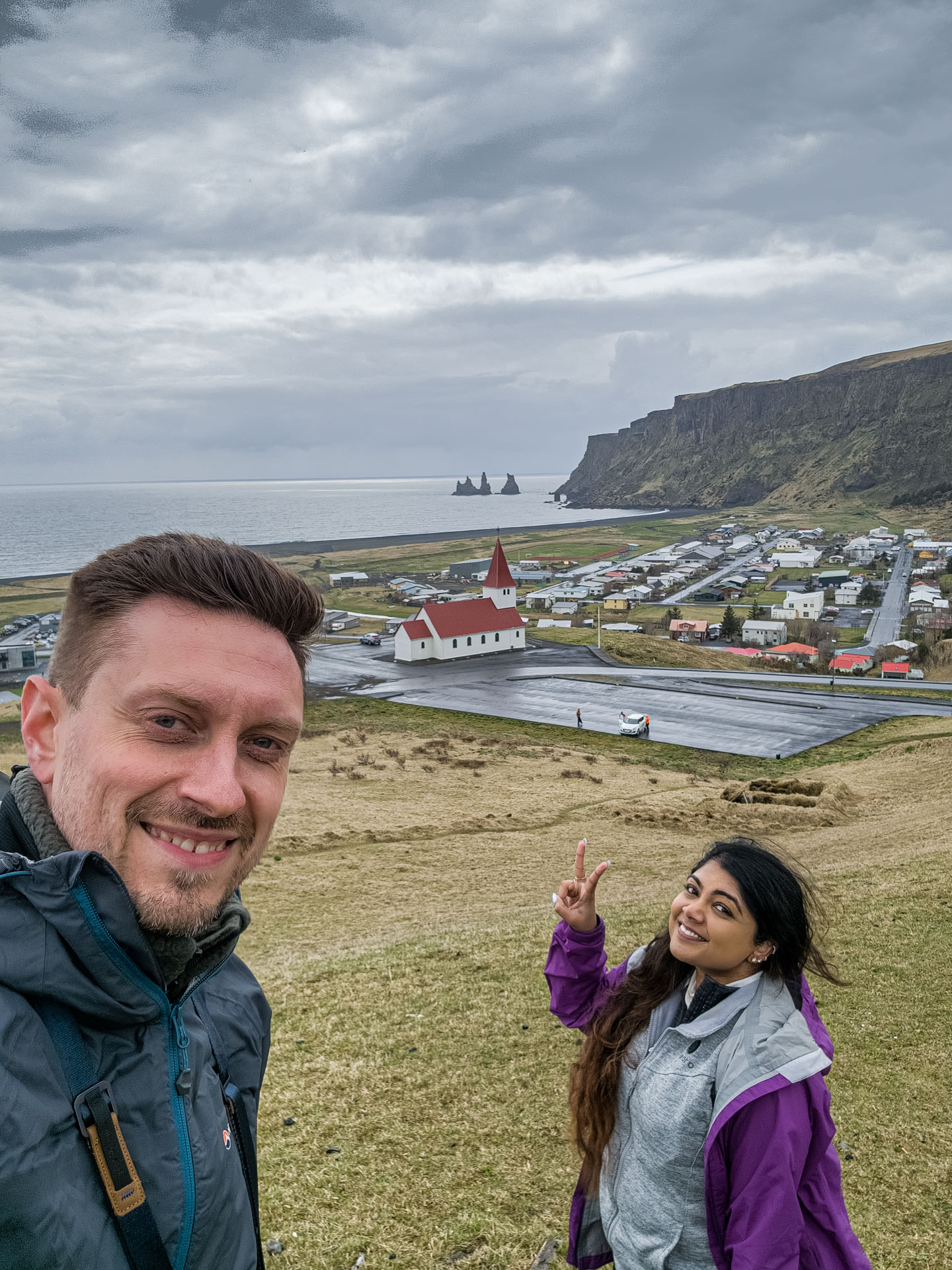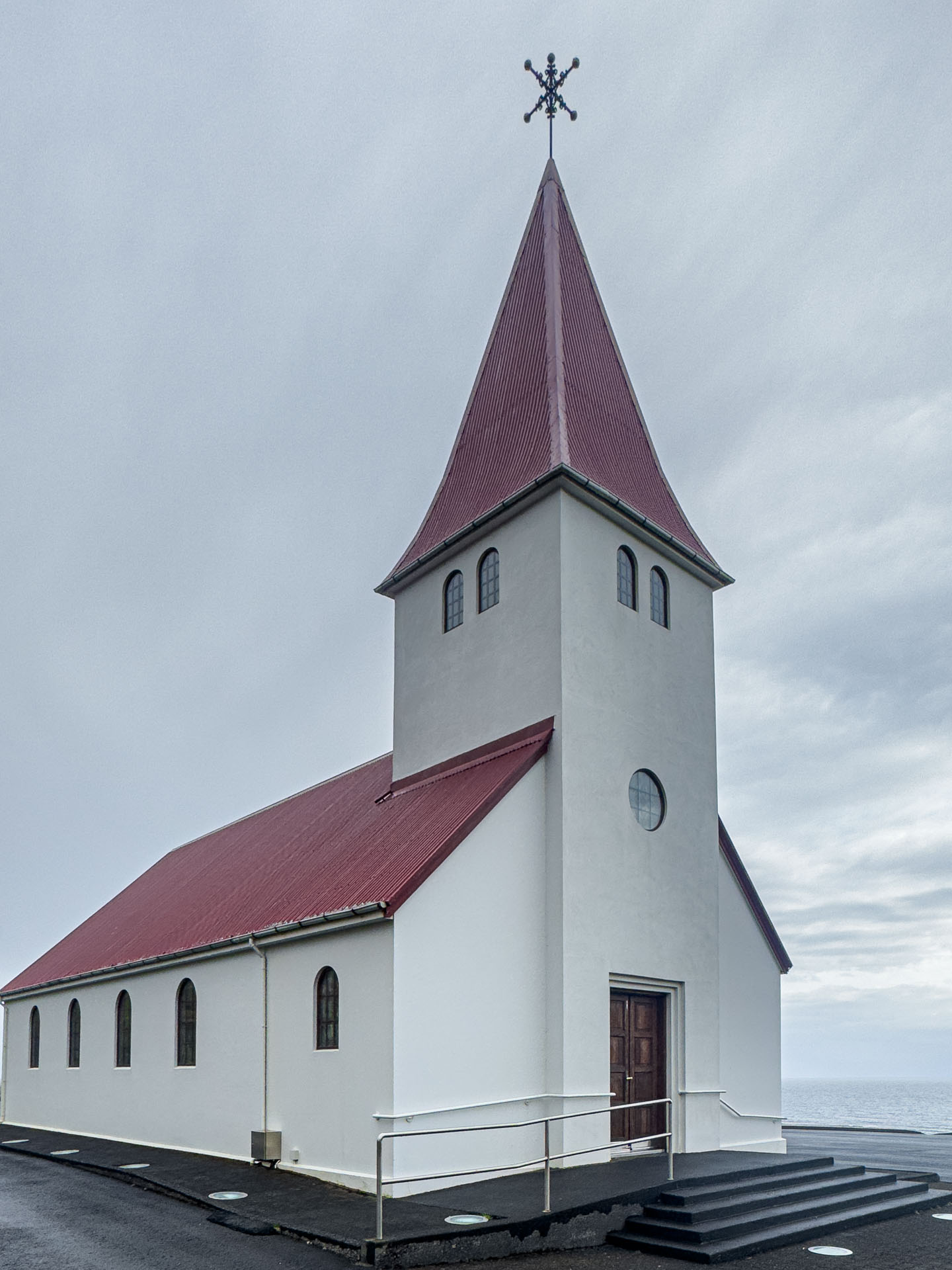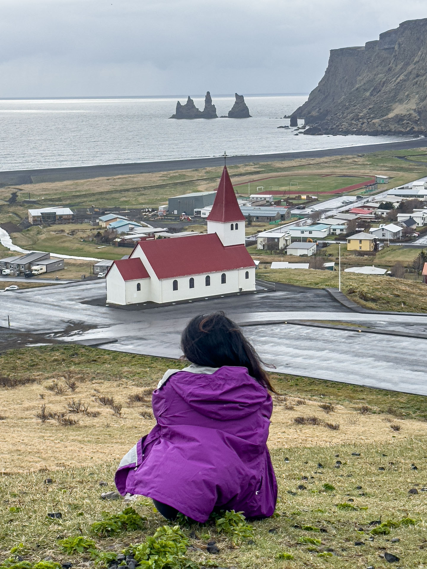 Climb the hill behind the church from the carpark to get the view of the church overlooking the village, which in turn overlooks the Reynisdrangar Basalt Stacks.