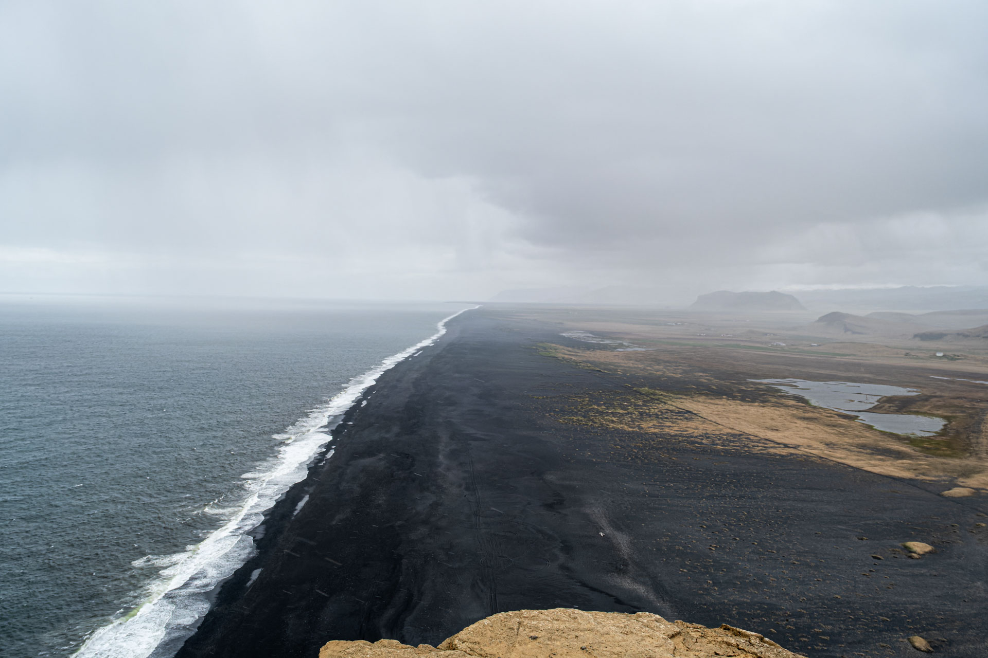 On our left is the rough ocean, waves crashing onto the beach below. To our right are the volcanoes and Mýrdalsjökull glacier. And stretching out in front of us as far as we can see is a black sand beach… with the dark storm clouds overhead, we can’t make out where the horizon ends and the sky begins.