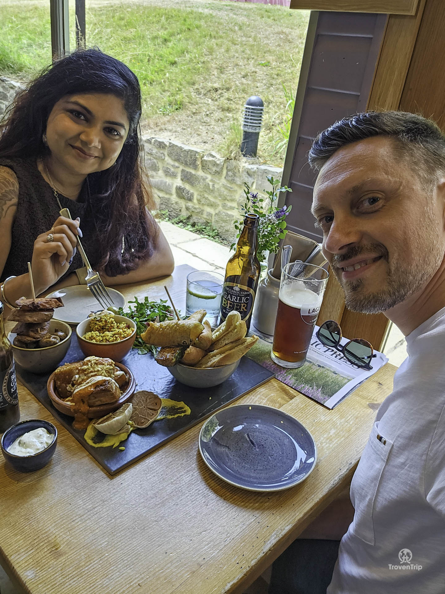 We have lunch and order the garlic sharing platter which comes loaded with roasted garlic bulbs, garlic bread & pitta, garlic mushrooms, garlic stuffed olives, and even Isle of Wight peri peri pork... everything garlic… and everything delicious.