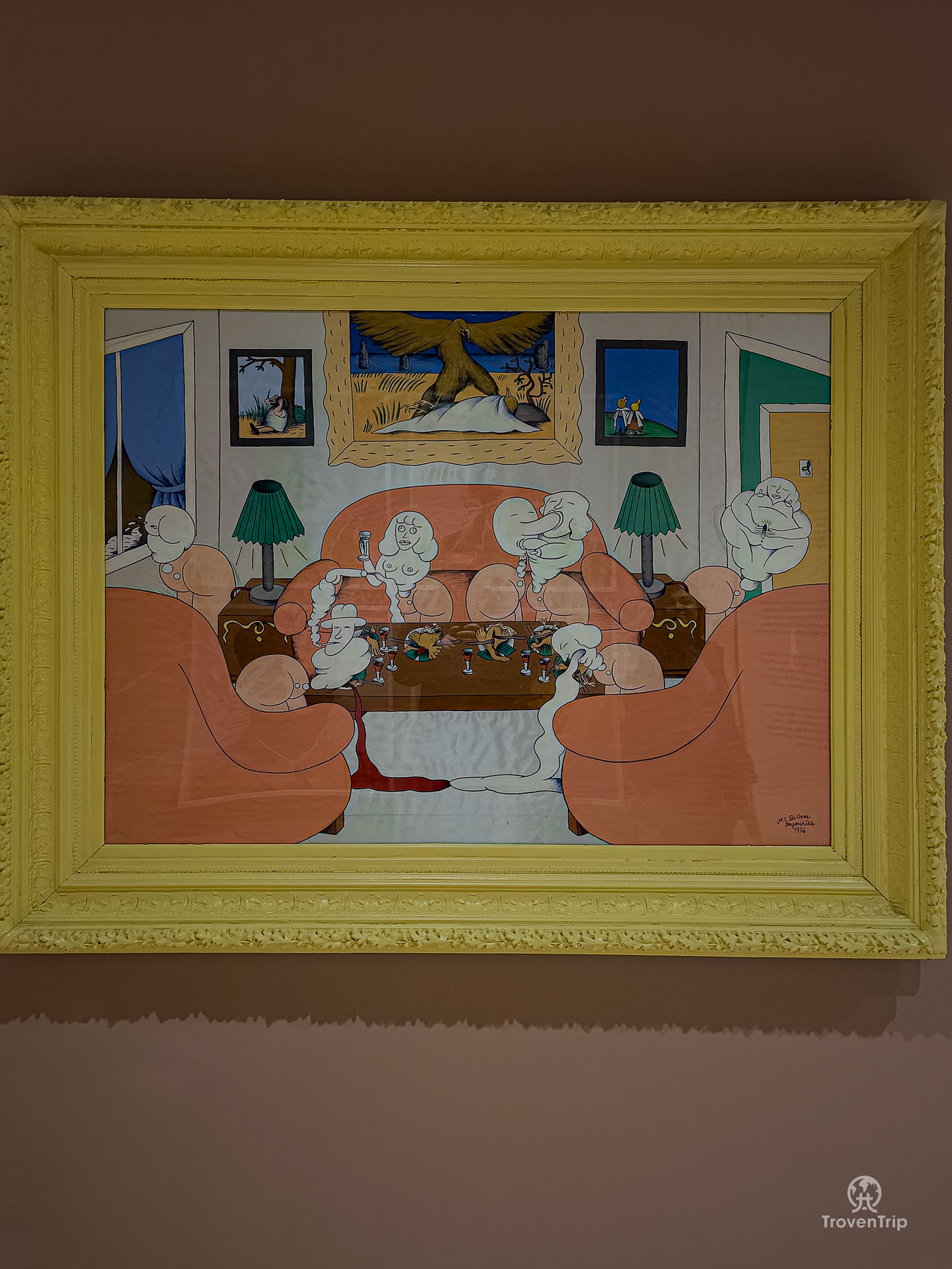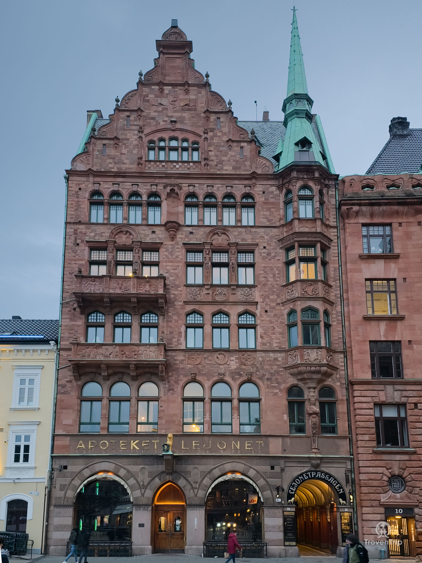 There is a really cool art sculpture, the Optimistorkestern (Optimistic orchestra), in front of a pharmacy housed in a beautiful old building.