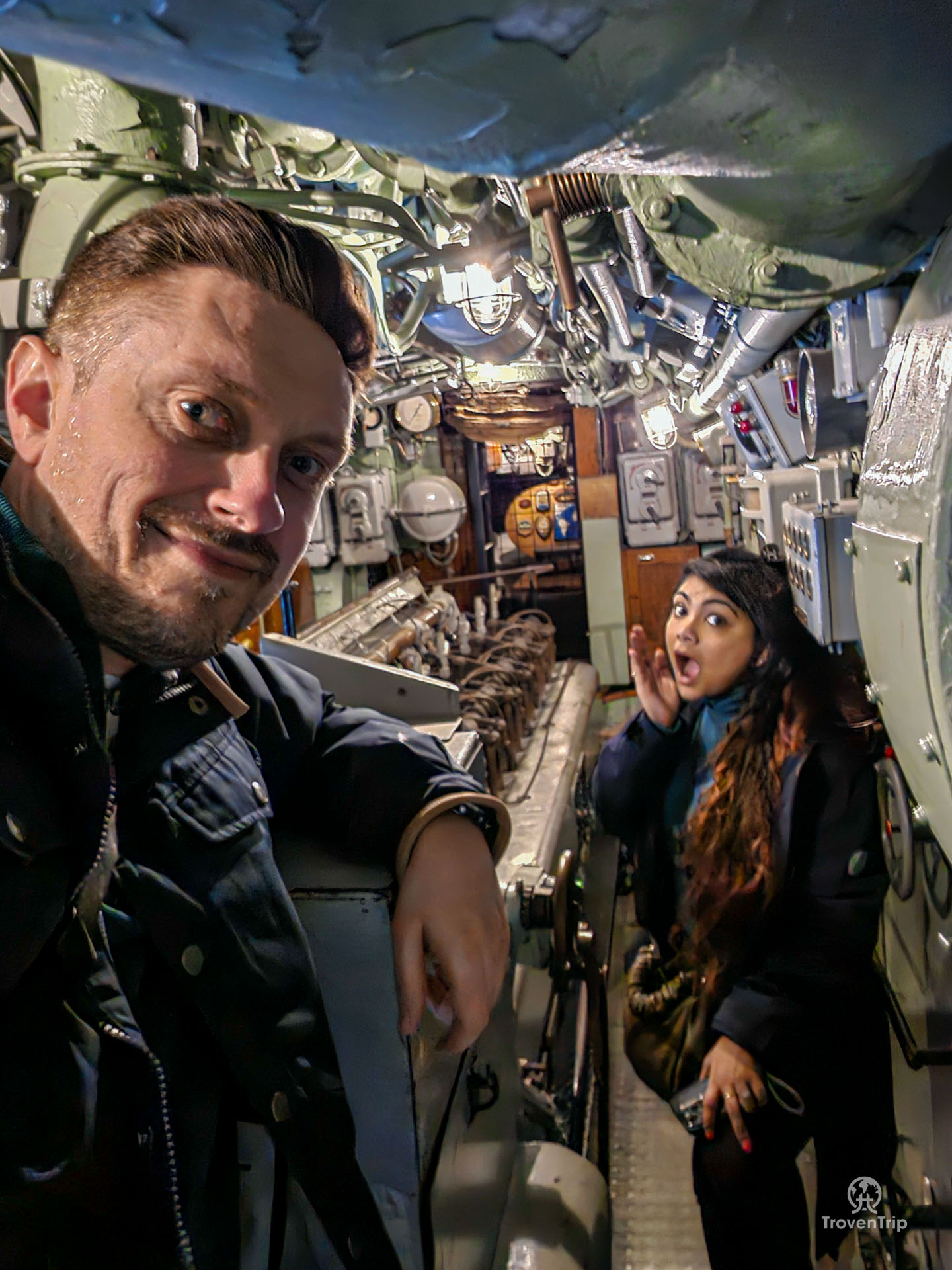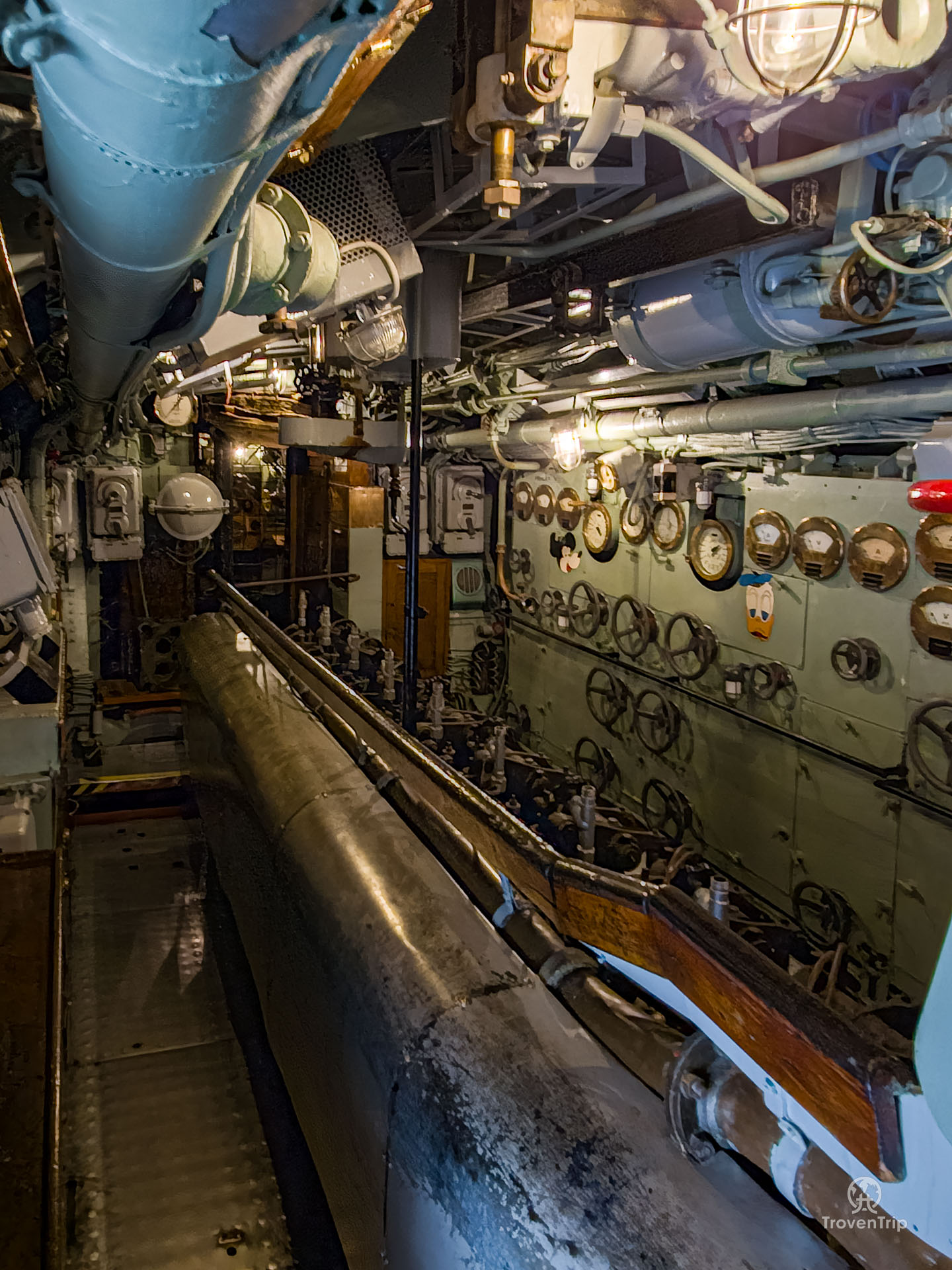 One end has a small (very small!) living quarters. We clamber through the tiny hatches into the engine room, and then at the far end is the navigation room. Even the escape hatch is tiny!