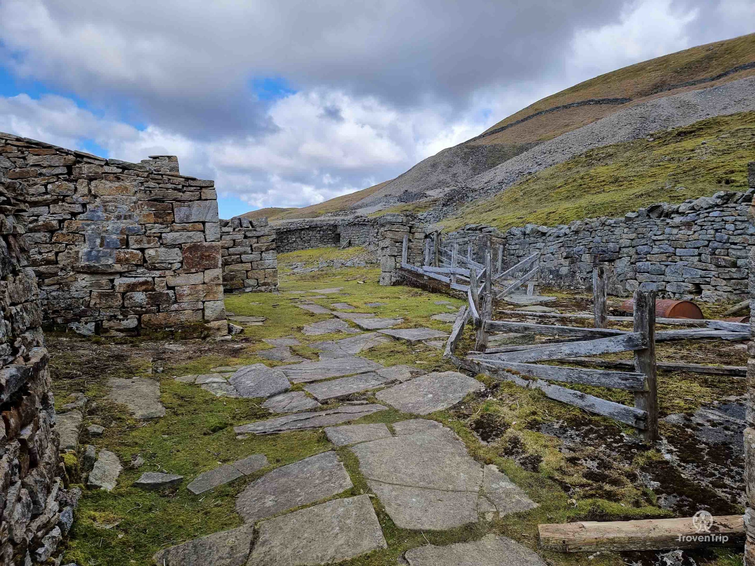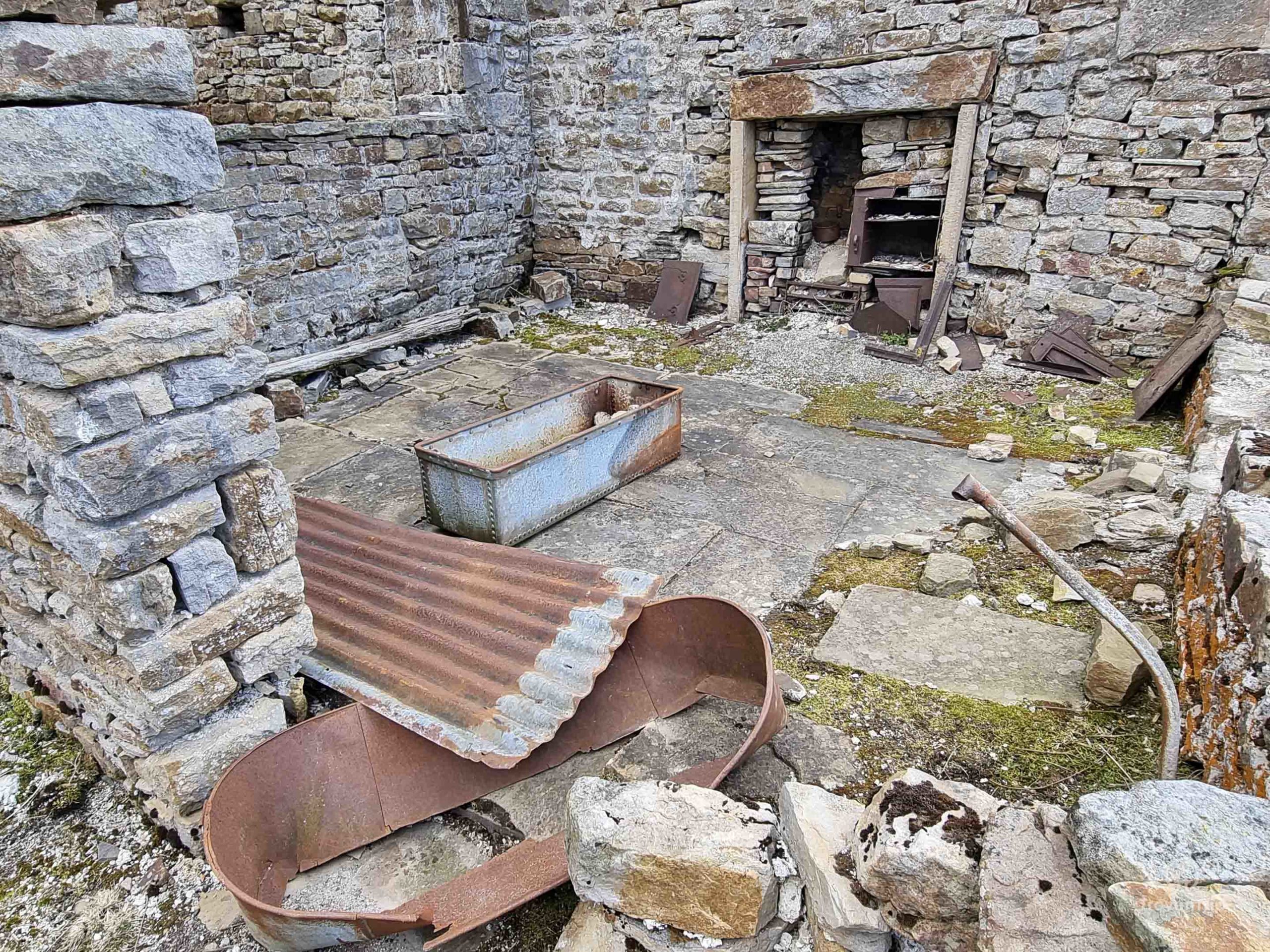 Despite the walls and roof being completely ruined on this part of the farmhouse, the rusty old tin bathtub is still on the floor, and the open range still contains an old pot and some broken fragments of pottery and glass. Behind me is another room with a big stone fireplace, and you can imagine huddling up in here with the fire roaring, as the winds and rain battered the old farmhouse in centuries gone by. And from each and every room, doorway, and window, the view out down the valley is amazing!