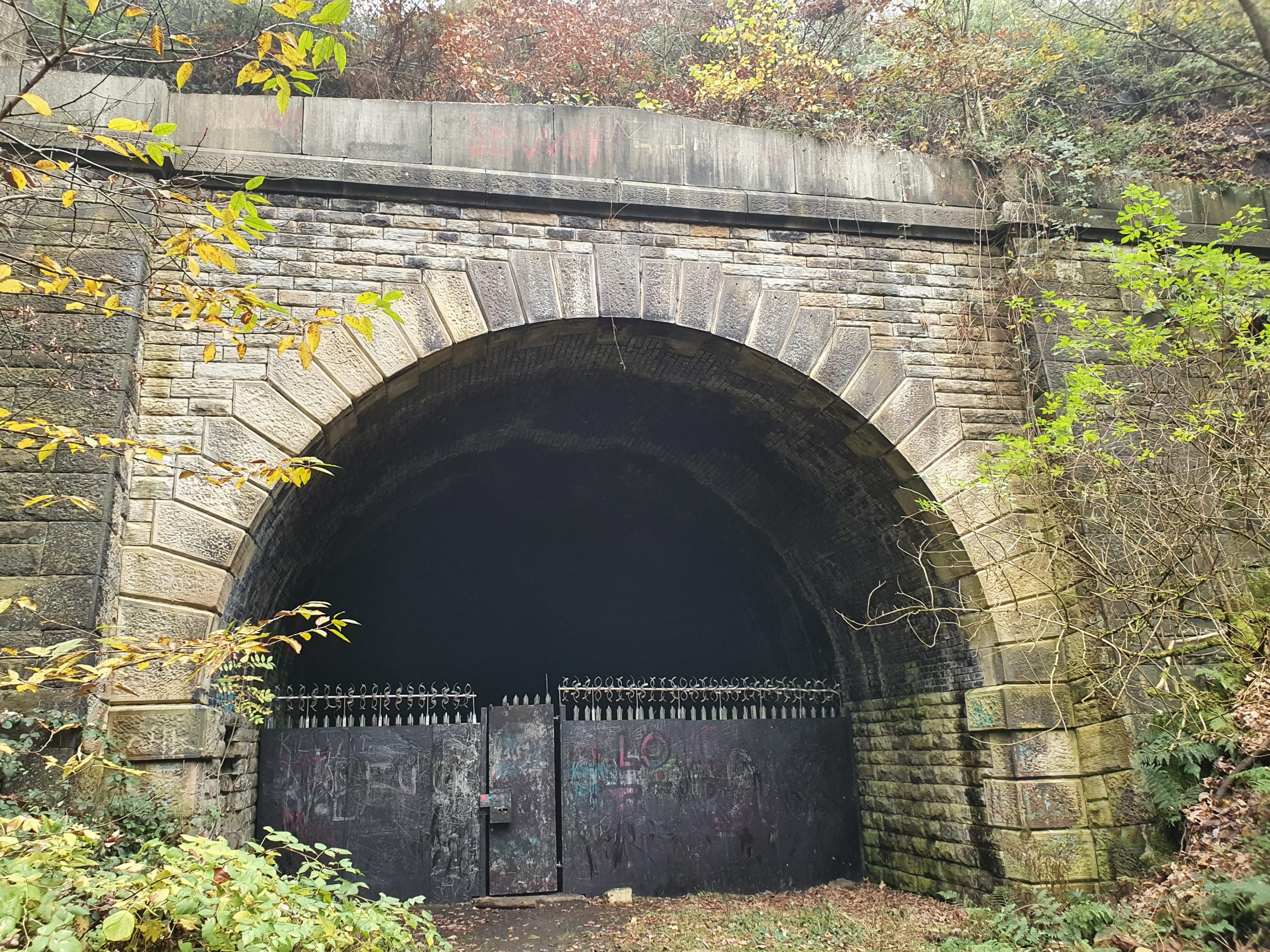 Next to the old station is the opening to Greenside tunnel… you can’t get down to the tunnel entrance from this side, but a walk along Smalewell Road to the Fox and Grapes pub leads you to a footpath, which you can then follow down into the woods and to the opposite entrance. It’s fenced off (usually) so you can’t go into the tunnel, but you can peer through the fence and just about see the other end shining through the S-shaped tunnel.