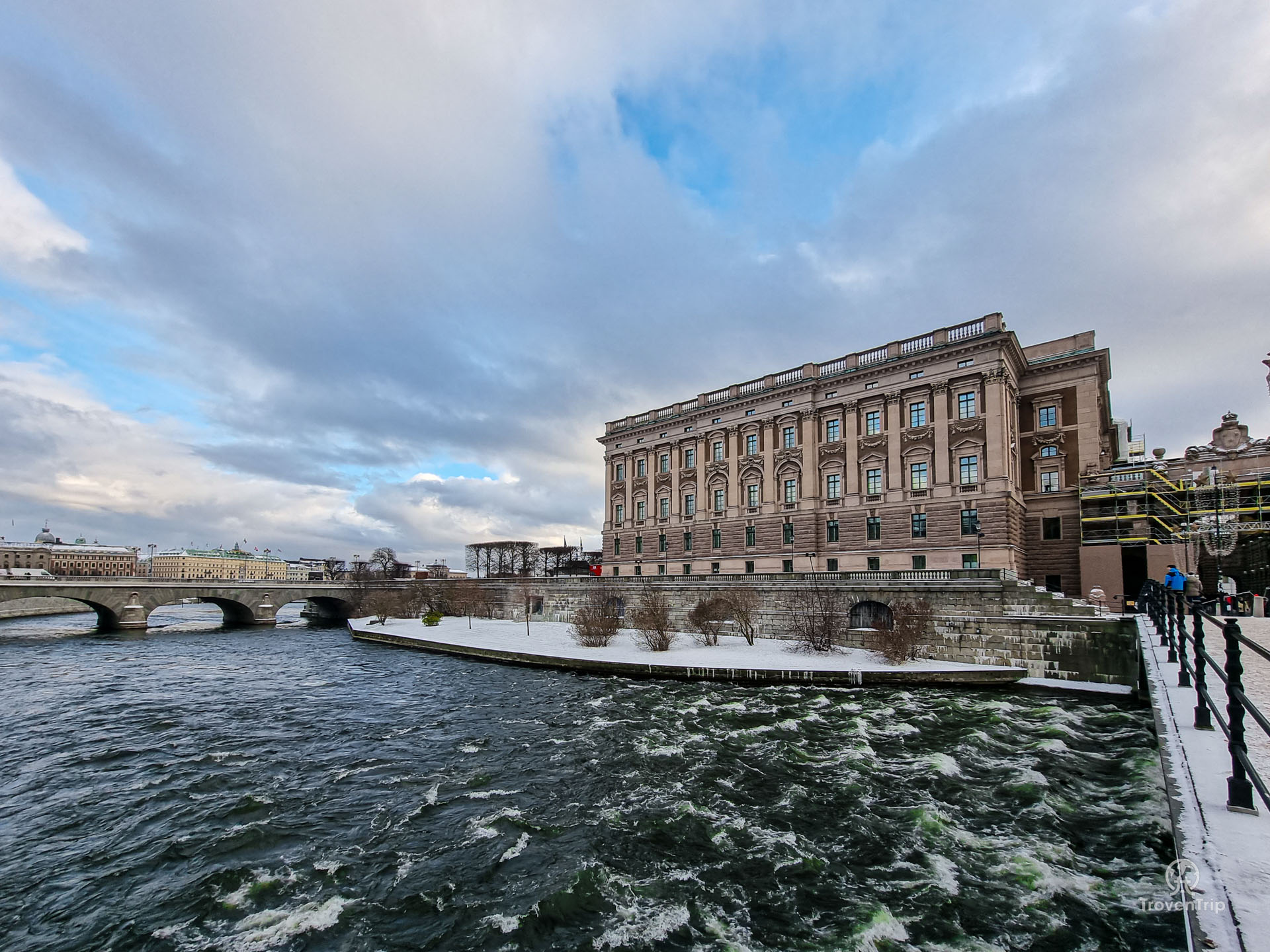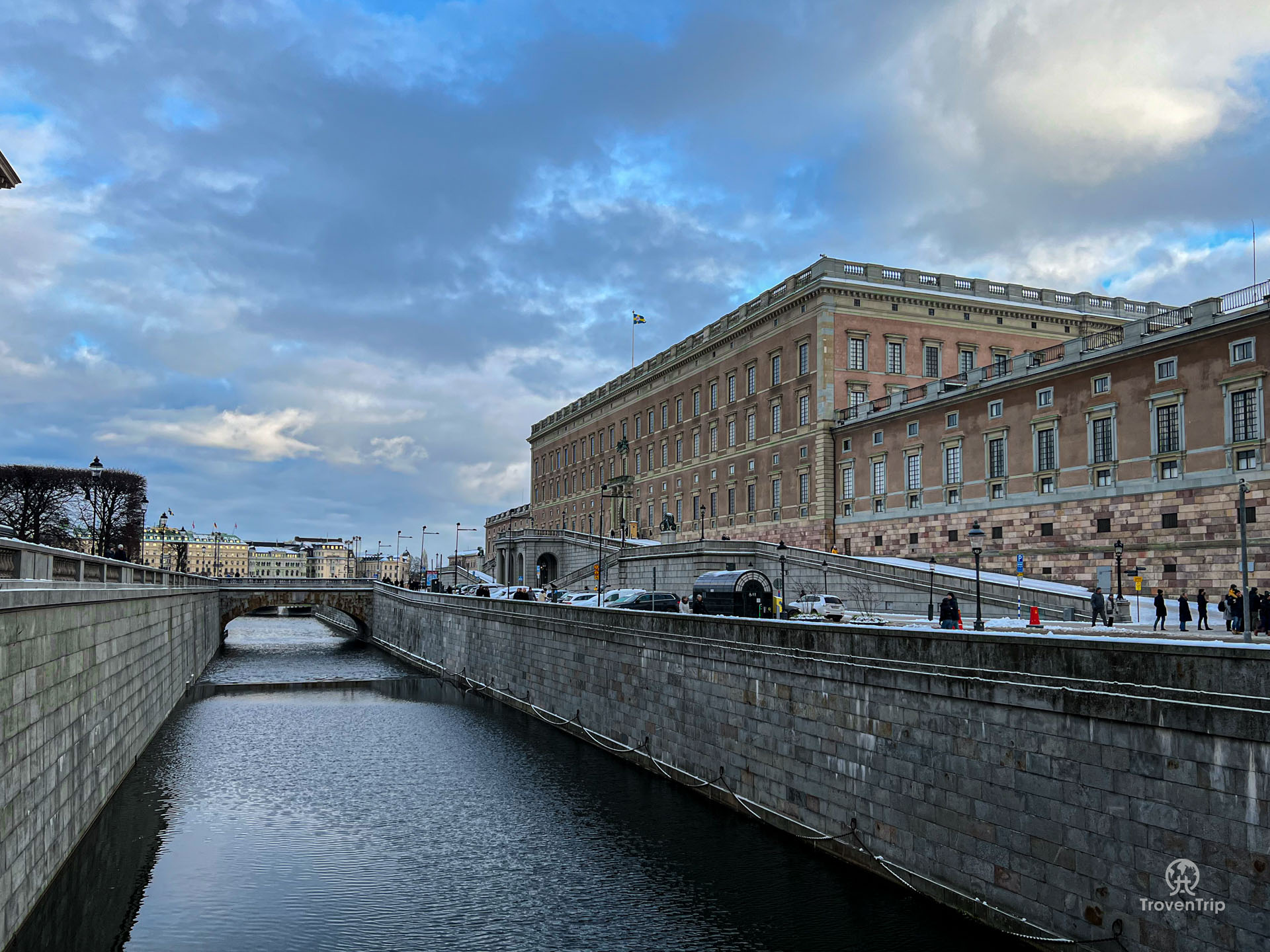 From the bridge you can see the Riksdagshuset, the Parliament buildings. And at the end of the bridge is Kungliga slottet, the Swedish Royal Palace.