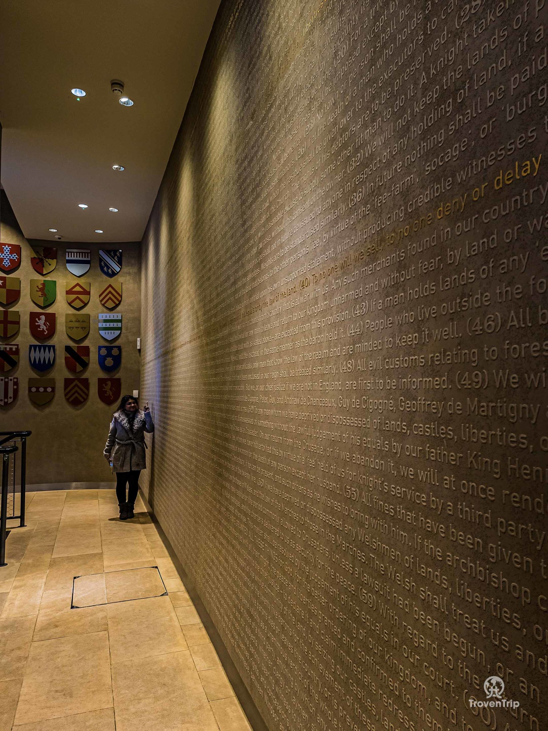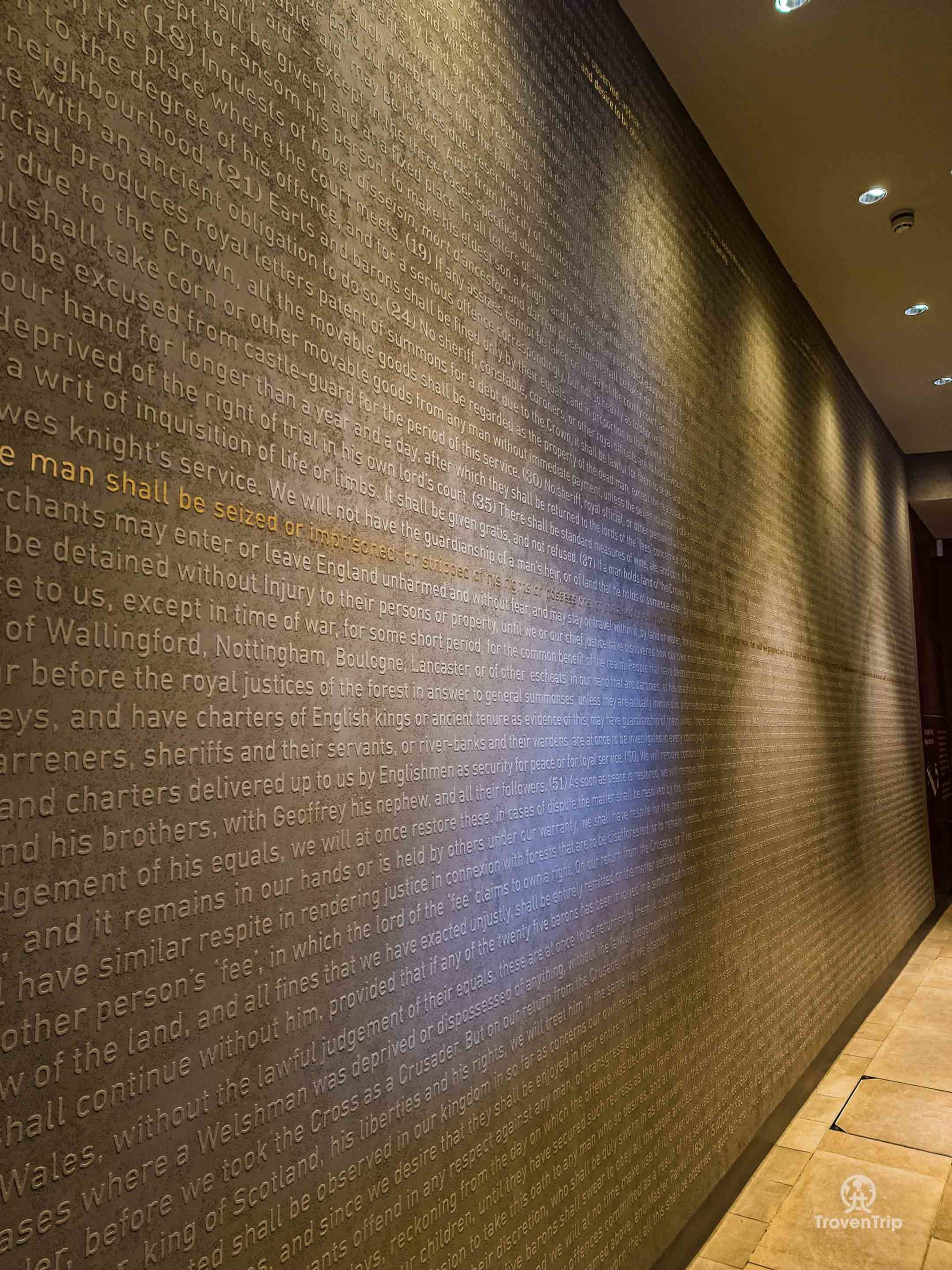 The Vault is really cool… the document is transcribed onto a huge wall as you enter (with the lines still in current law emboldened in gold), and there is a dark room where the document is (usually) on display, and a cinema room below with a short video telling the history and importance of the document. We say usually on display, as today it’s actually undergoing a restoration (which we knew about thanks to the info on the website), so instead we see the Charter of the Forest, a companion document limiting private property rights and establishing the rights of free men to access royal forests (essentially stopping the rich owning all land and preventing the commoners from accessing it!). The pieces of paper it’s written on are tiny, but the handwriting is perfectly scribed.