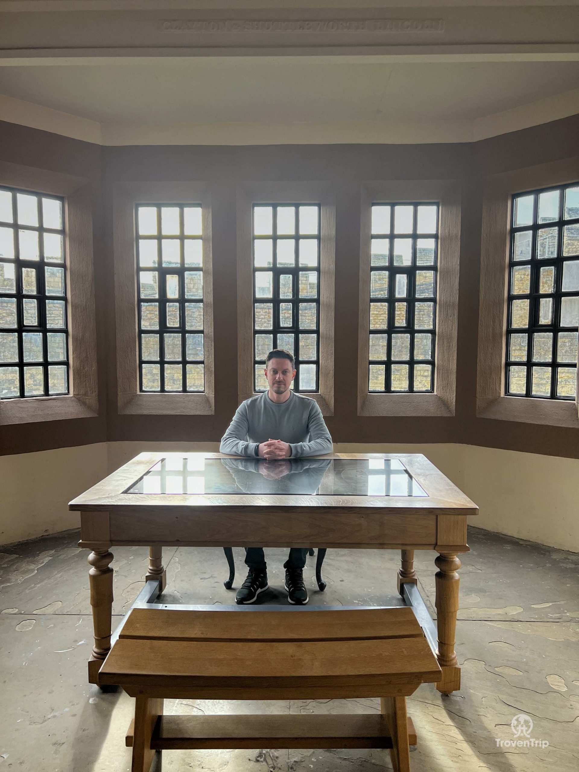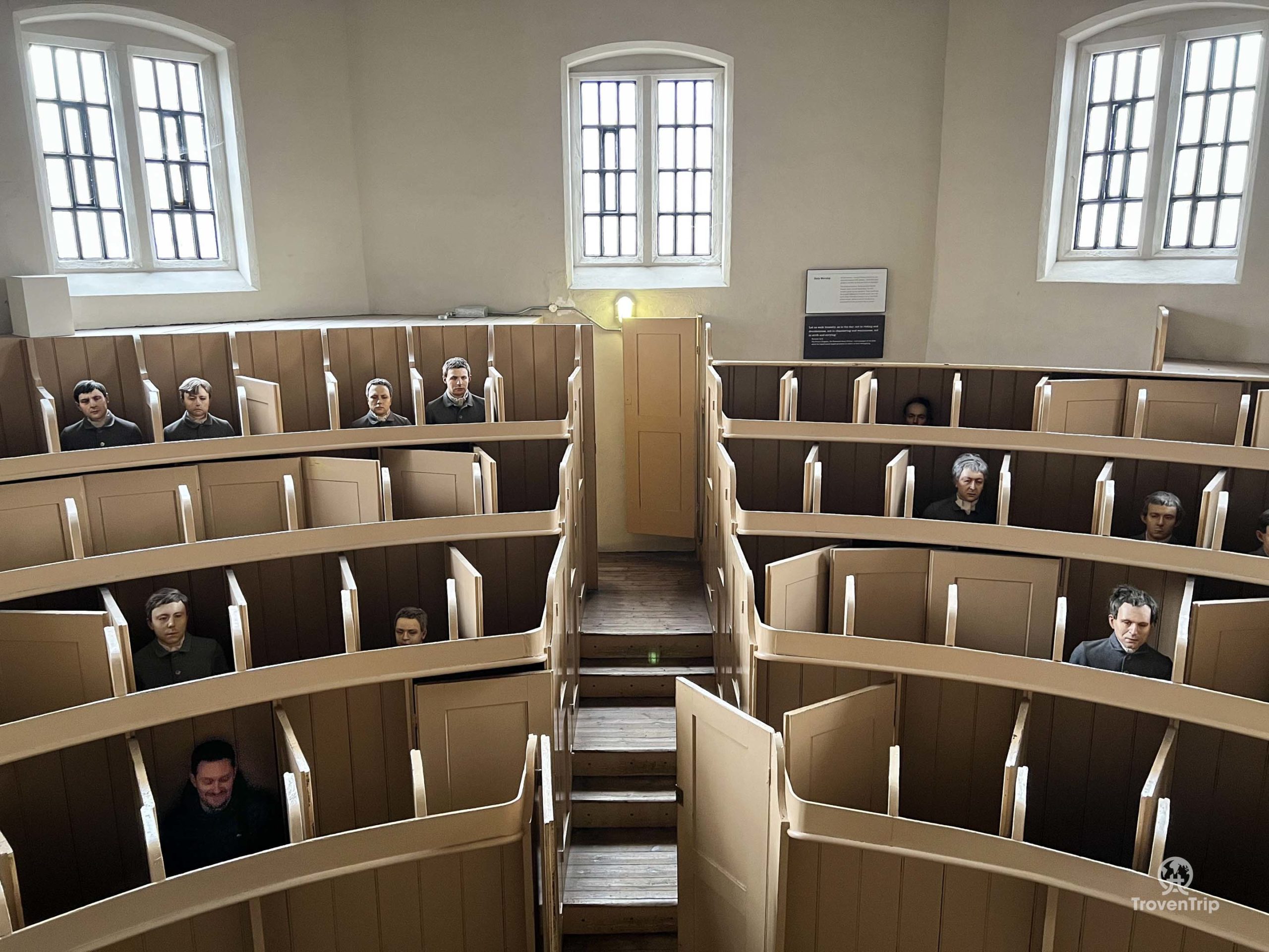 We move through history as we leave the vault and enter the prison… our first stop being in the bizarre chapel… each inmate was led to an isolation booth where all they could see was the pulpit to stop any interaction with other prisoners. Paul goes and sits in one of the booths, while Sneha climbs up onto the pulpit ready to give the service to the onlooking prisoners!