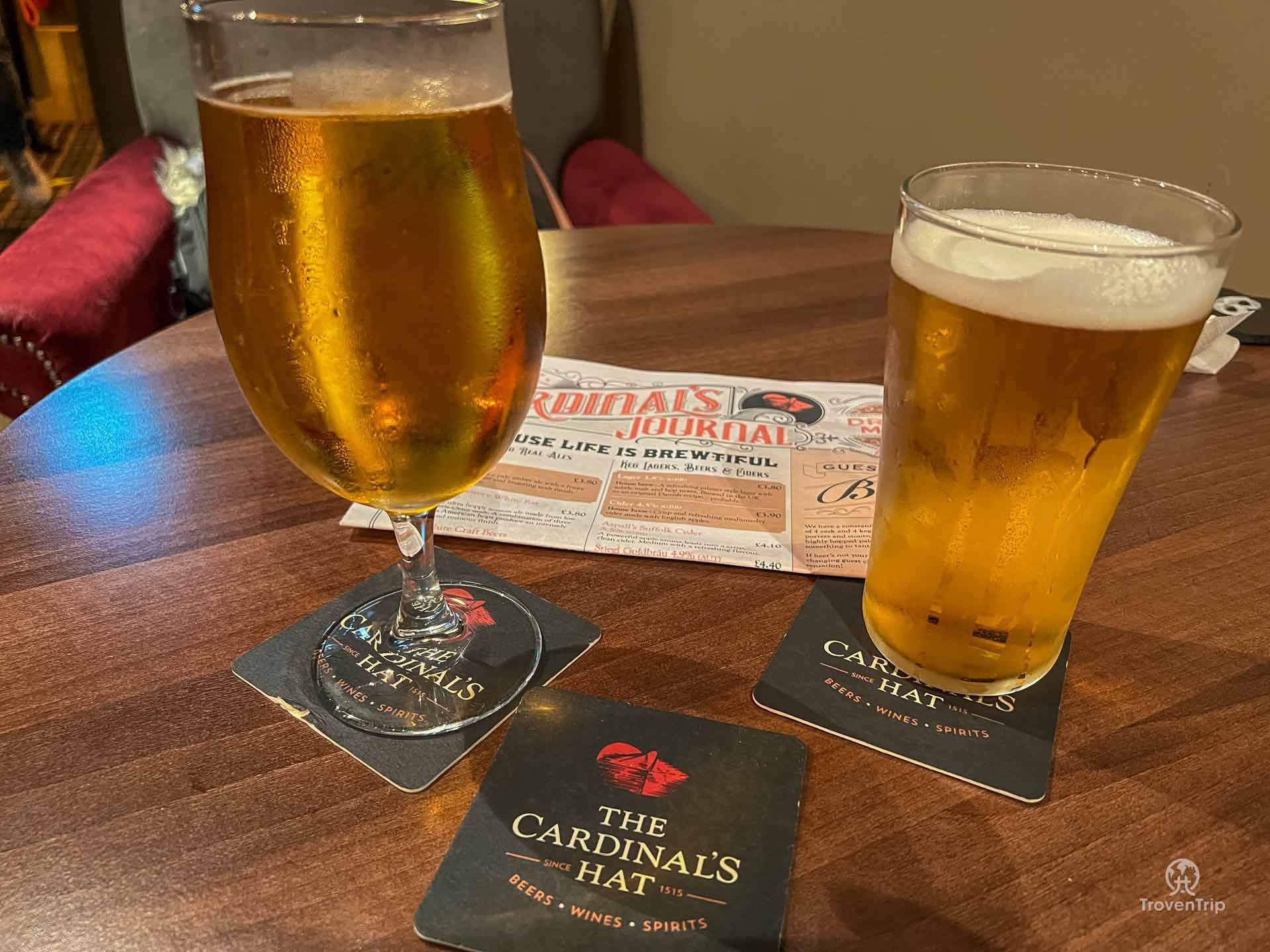 We walked past The Cardinal’s Hat earlier which said it was the oldest pub in Lincoln and looked quite cool, so we go back there. It’s really busy inside but we manage to get a table upstairs, so our day ends relaxing with a pint of local Cardinal’s lager and cider, soaking up the last bit of history for the day in the city’s oldest pub.