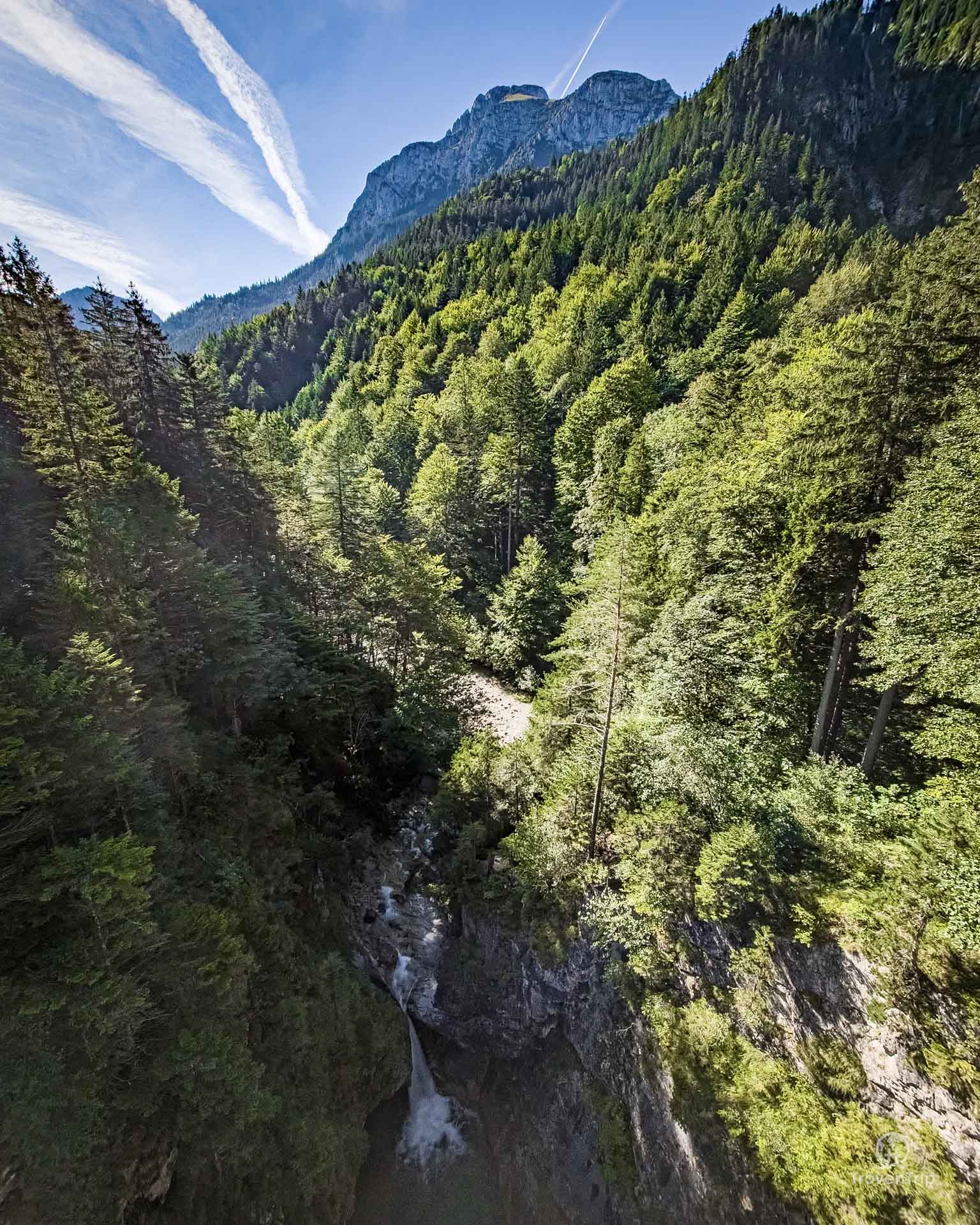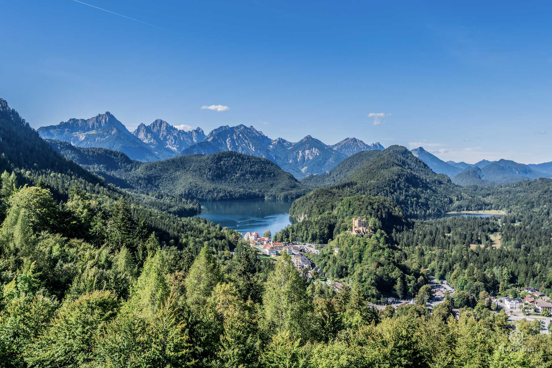 We're standing above a huge ravine, with Neuschwanstein Castle standing proud on top of the hill at the other side. And beyond the castle in the distance is the Forgensee Reservoir shining in the morning sun, and the Zweiselberg Mountains!