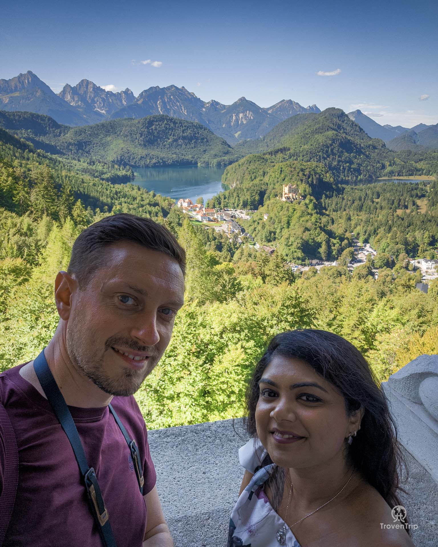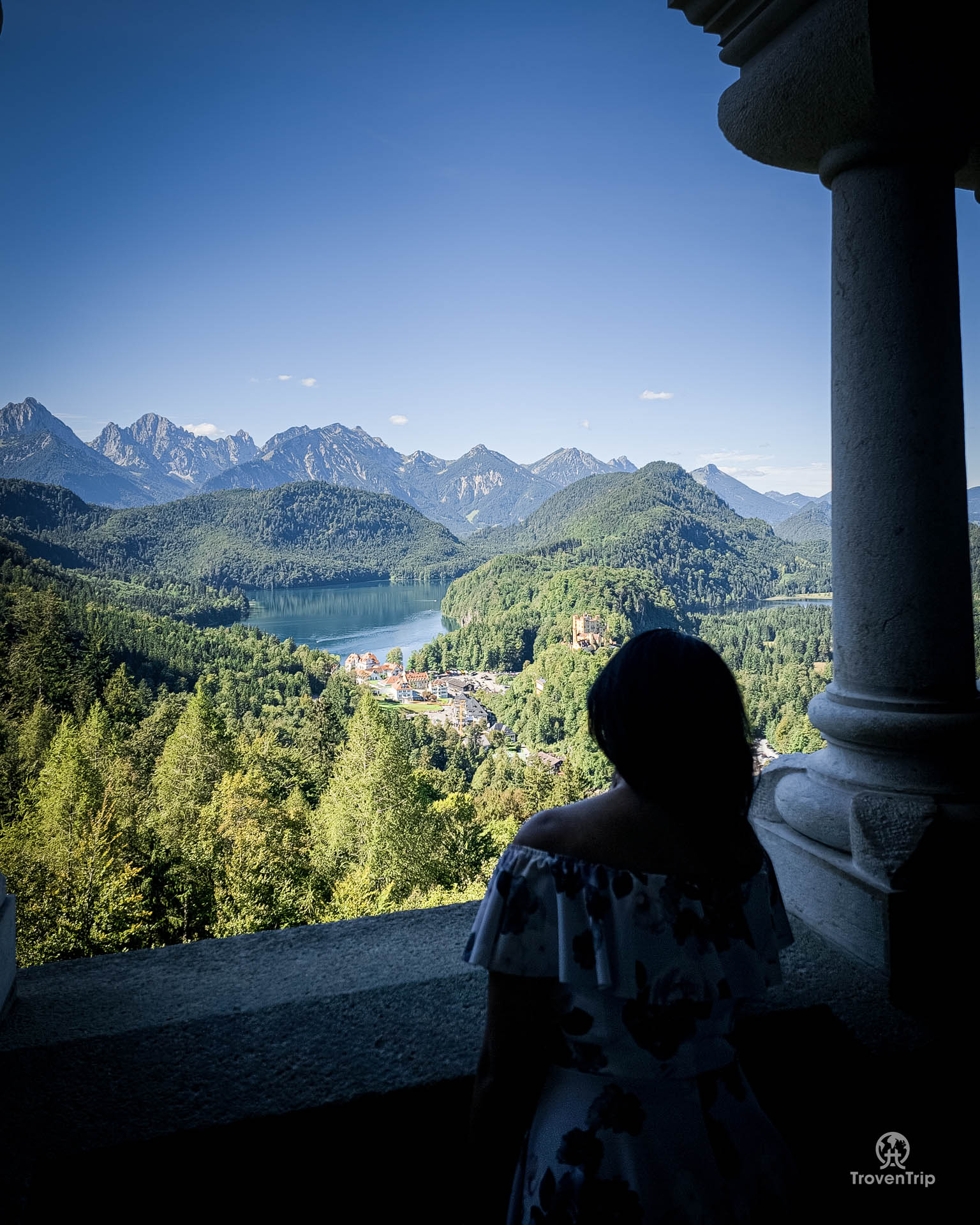 We’re stood on a colonnaded balcony on the side of the castle, looking towards Hohenschwangau Castle, Alpsee Lake, and the surrounding mountains.
