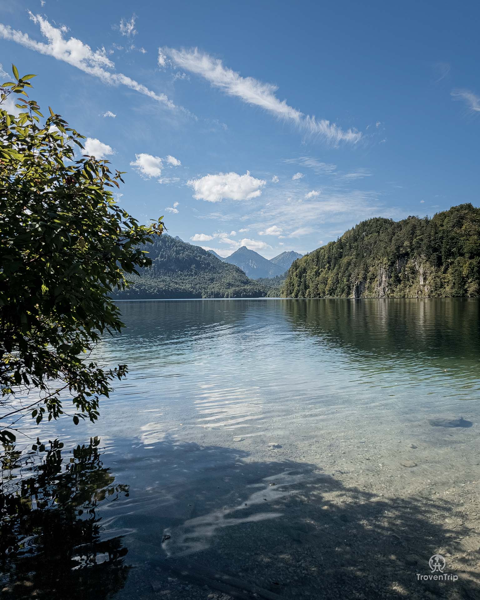 Alpsee Lake is a glacial lake in the Bavarian Alps, sitting below Neuschwanstein Castle and Hohenschwangau Castle.