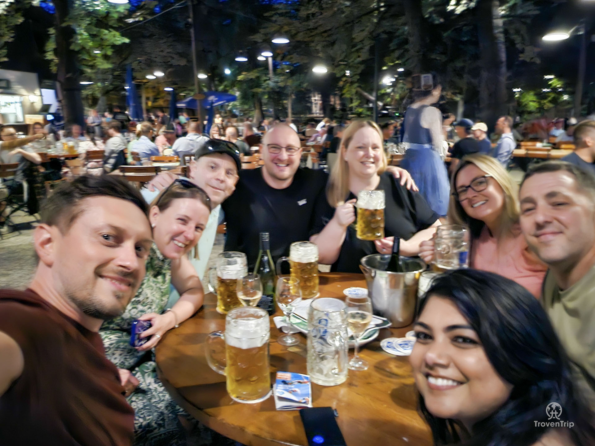 We get one of the few tables left outside big enough to fit our group, and many steins of beer later, we’re signing along to all of the songs being played by the live band!
