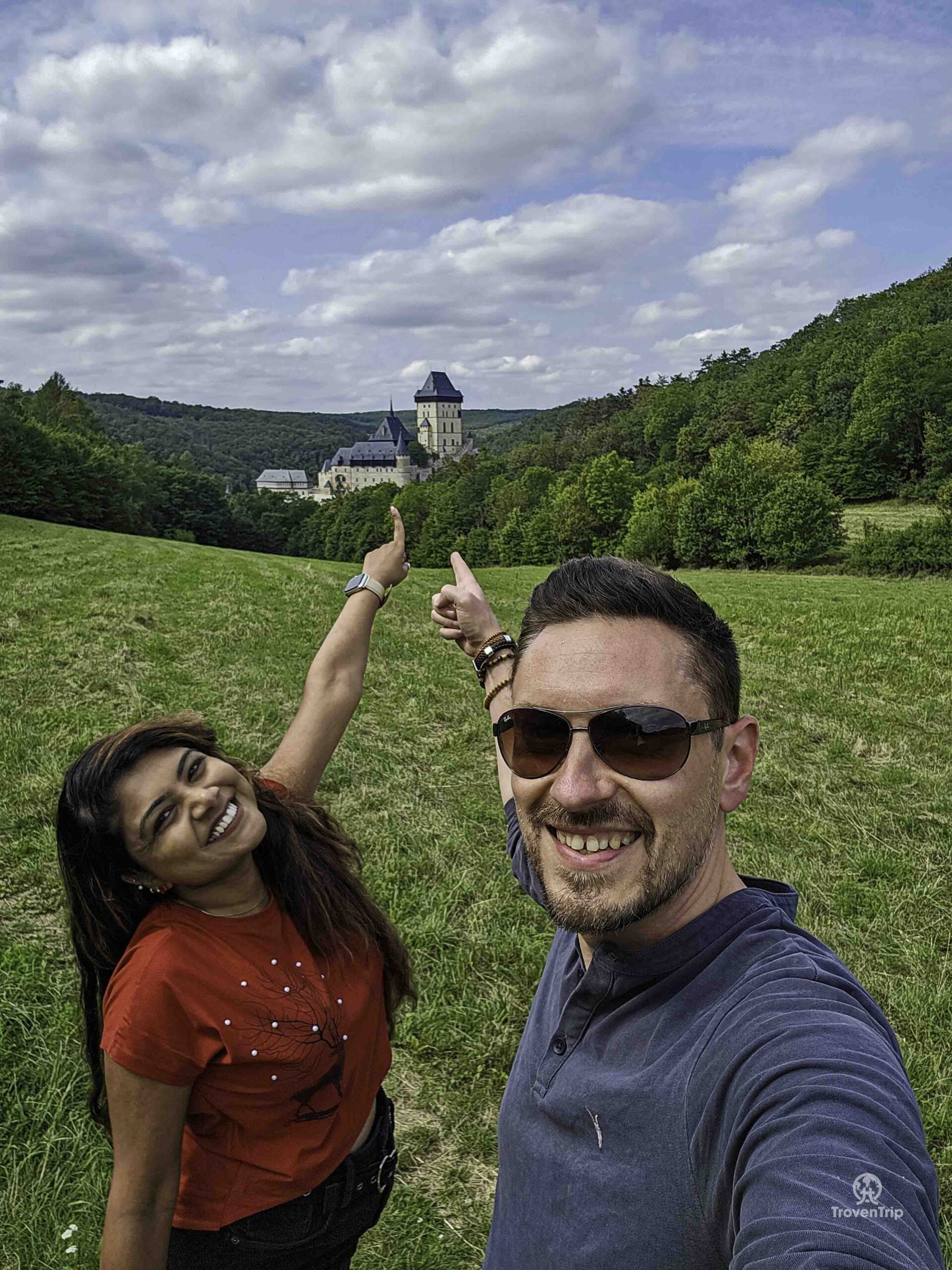 We then follow the trail for 10-minutes uphill through the forest, and just as we’re starting to wonder if we should turn back as we’re running out of time, the trees end and we enter a huge meadow. We keep going and there it is… the view of Karlstejn Castle from the Rockstar movie!!!