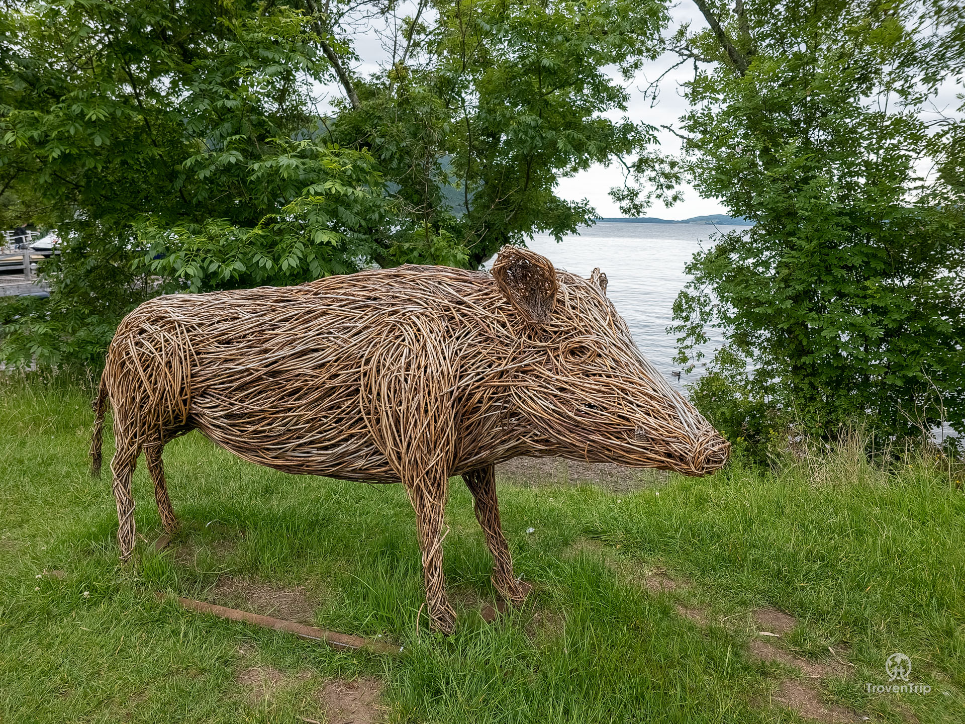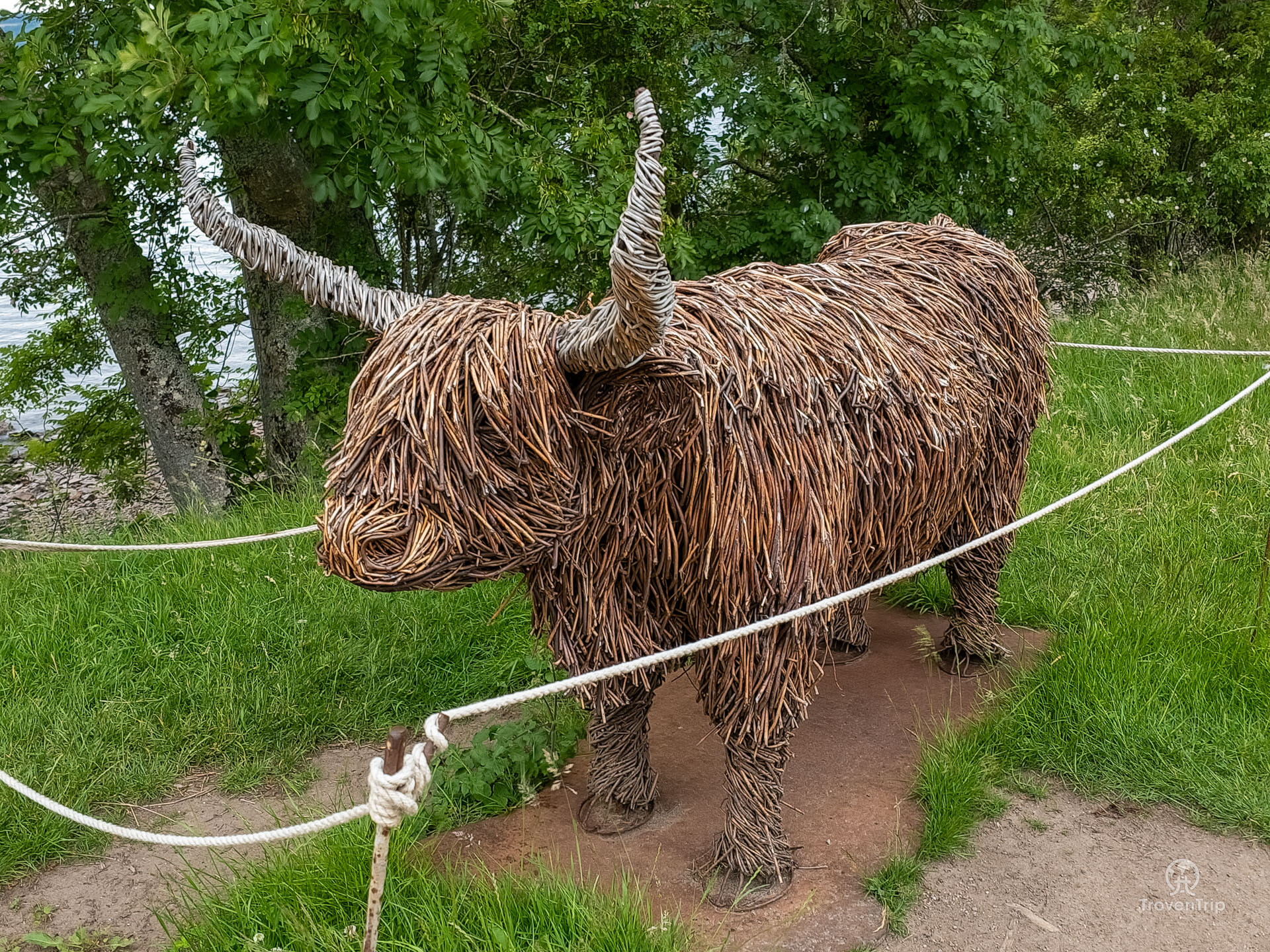 We disembark from the boat at the small pier and make our way up to the Castle, but not before stopping at some cool straw artworks of a hairy cow and a wild boar! (the photos looking up at the castle are also pretty good!)