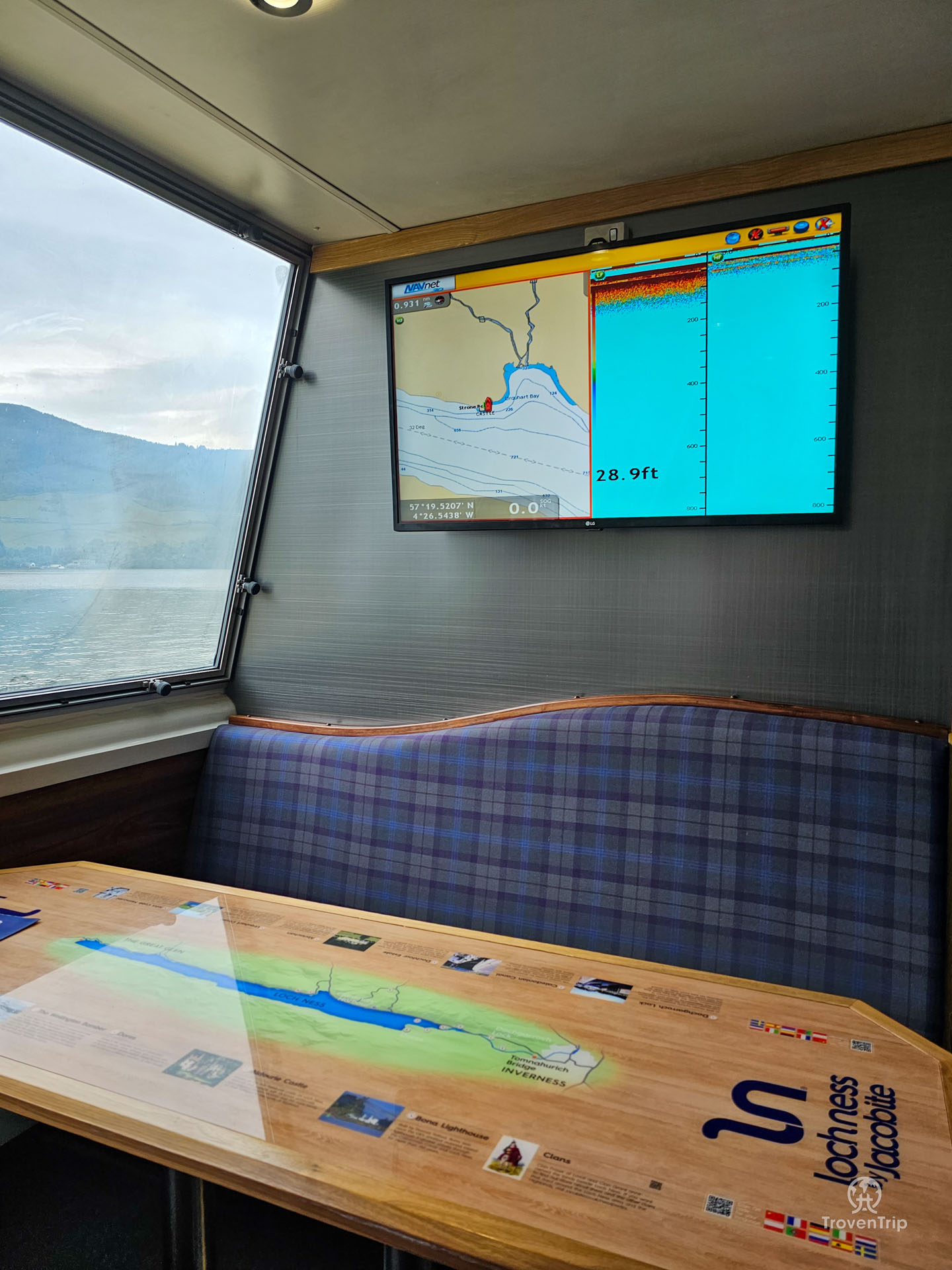Onboard we have an audio guide telling us some of the fact’s and history about the Loch and Castle (Paul is amazed at the fact that Loch Ness holds more water than all of the lakes in England and Wales put together!!). And there is a sonar system showing the depth of the Loch as we cruise… hopefully going to show some abnormalities to suggest Nessie is swimming below!