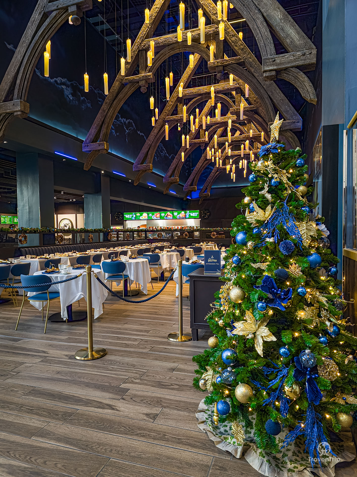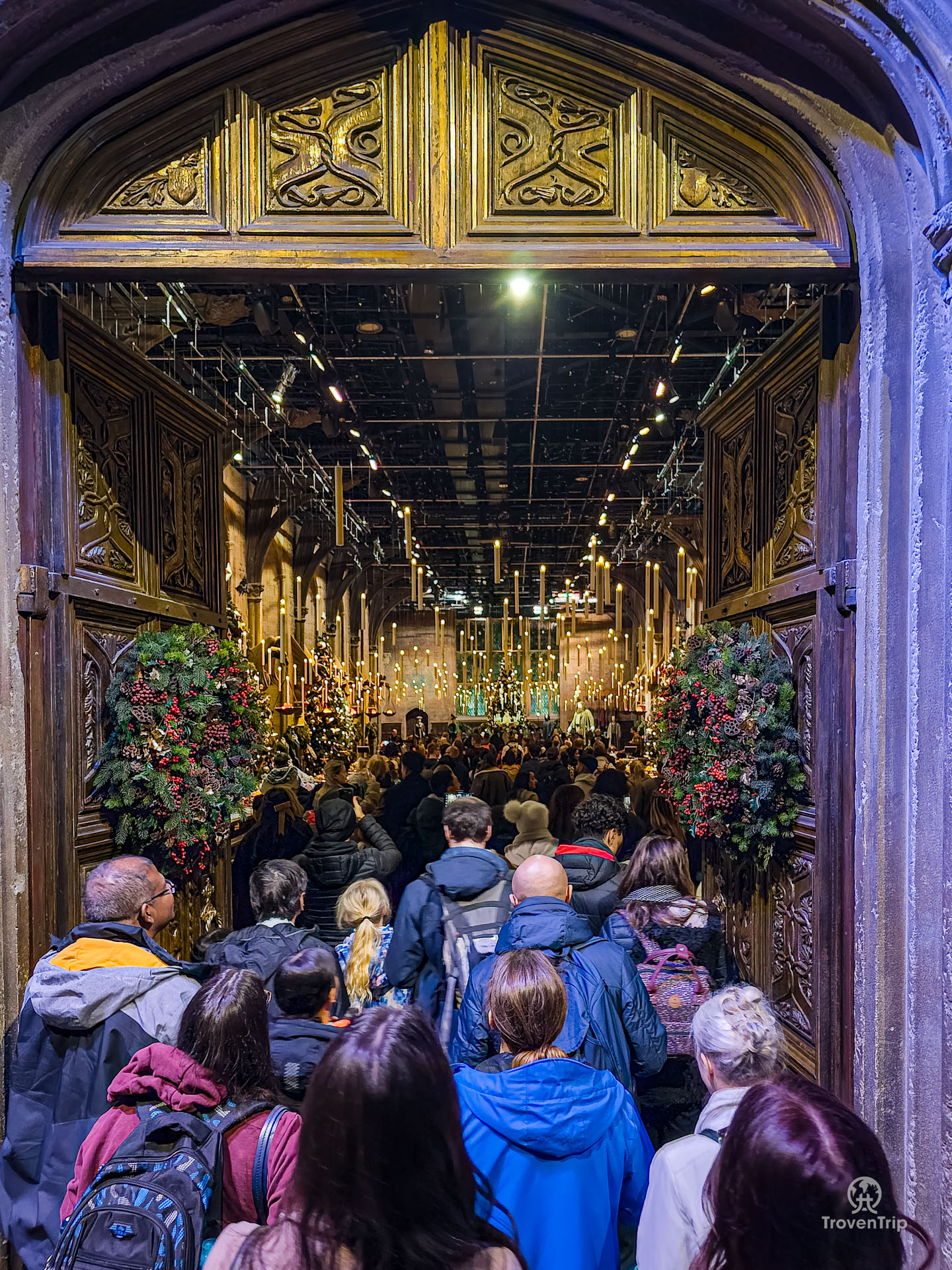 It's a huge cavernous hall with candles hanging from the ceiling. Long tables full of food and drink as if we've entered mid-feast. And beautiful Christmas trees and decorations for the festive period.