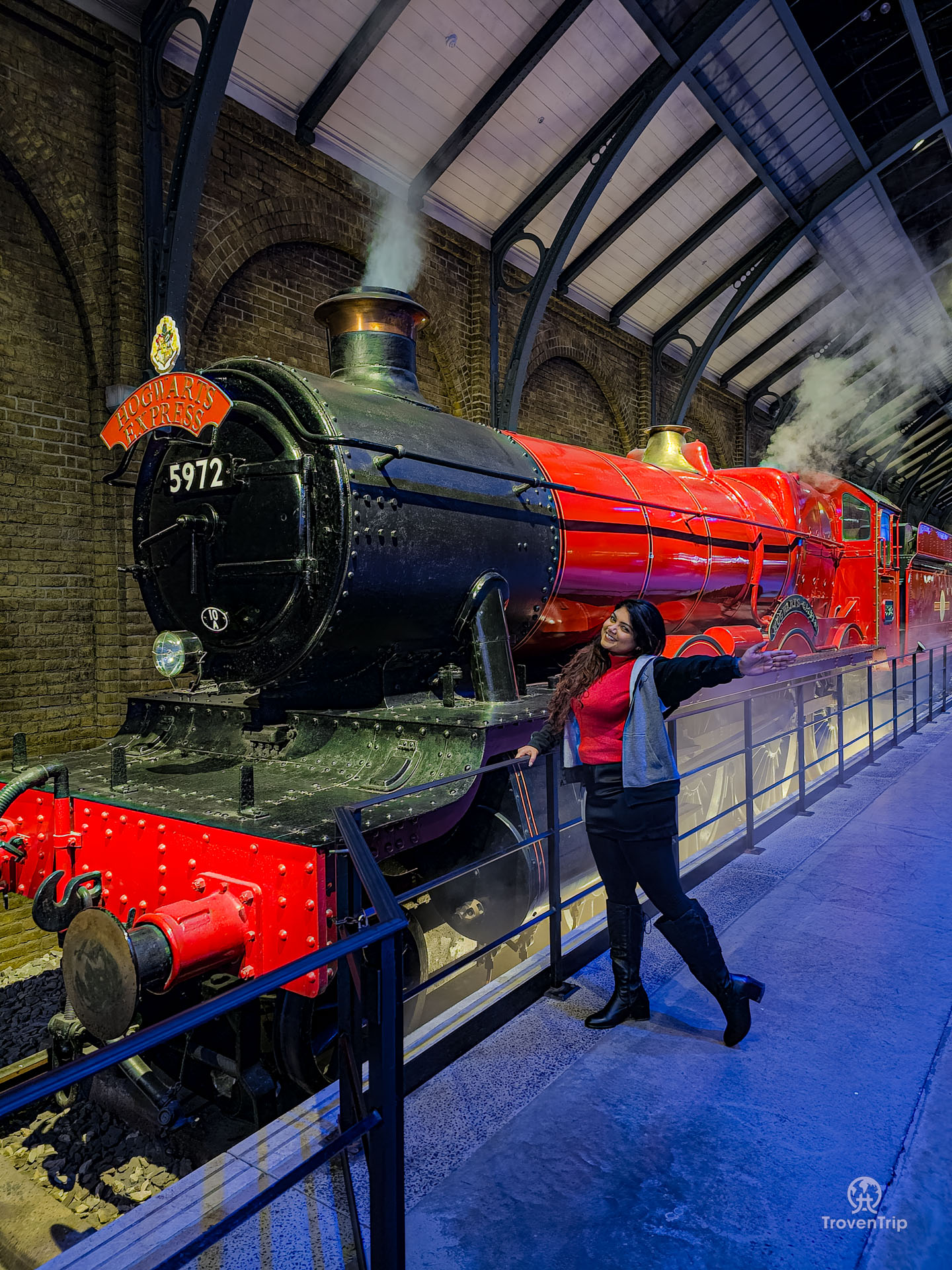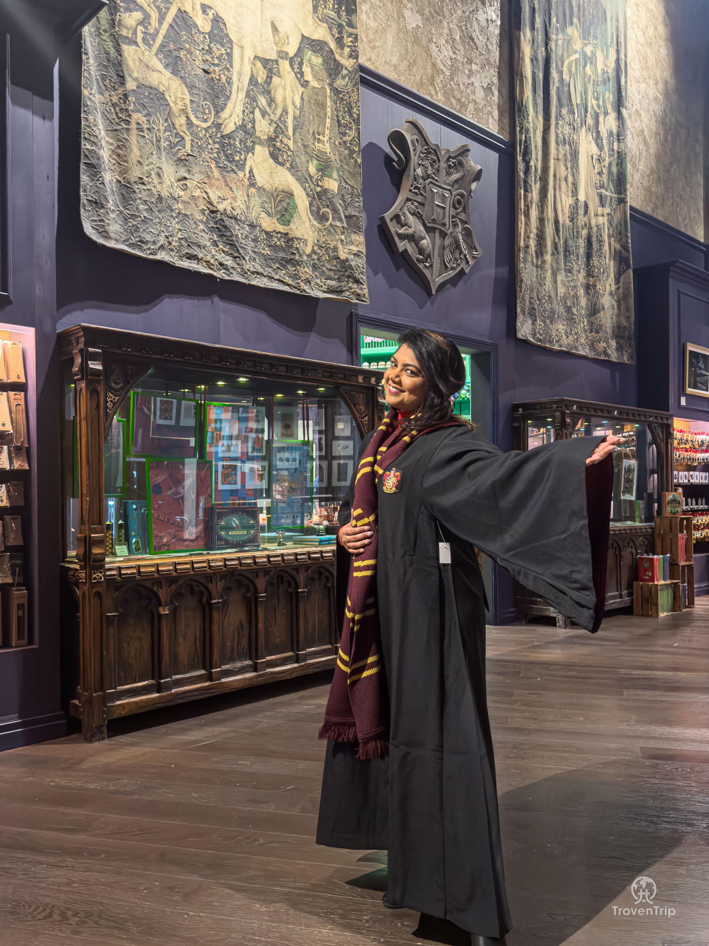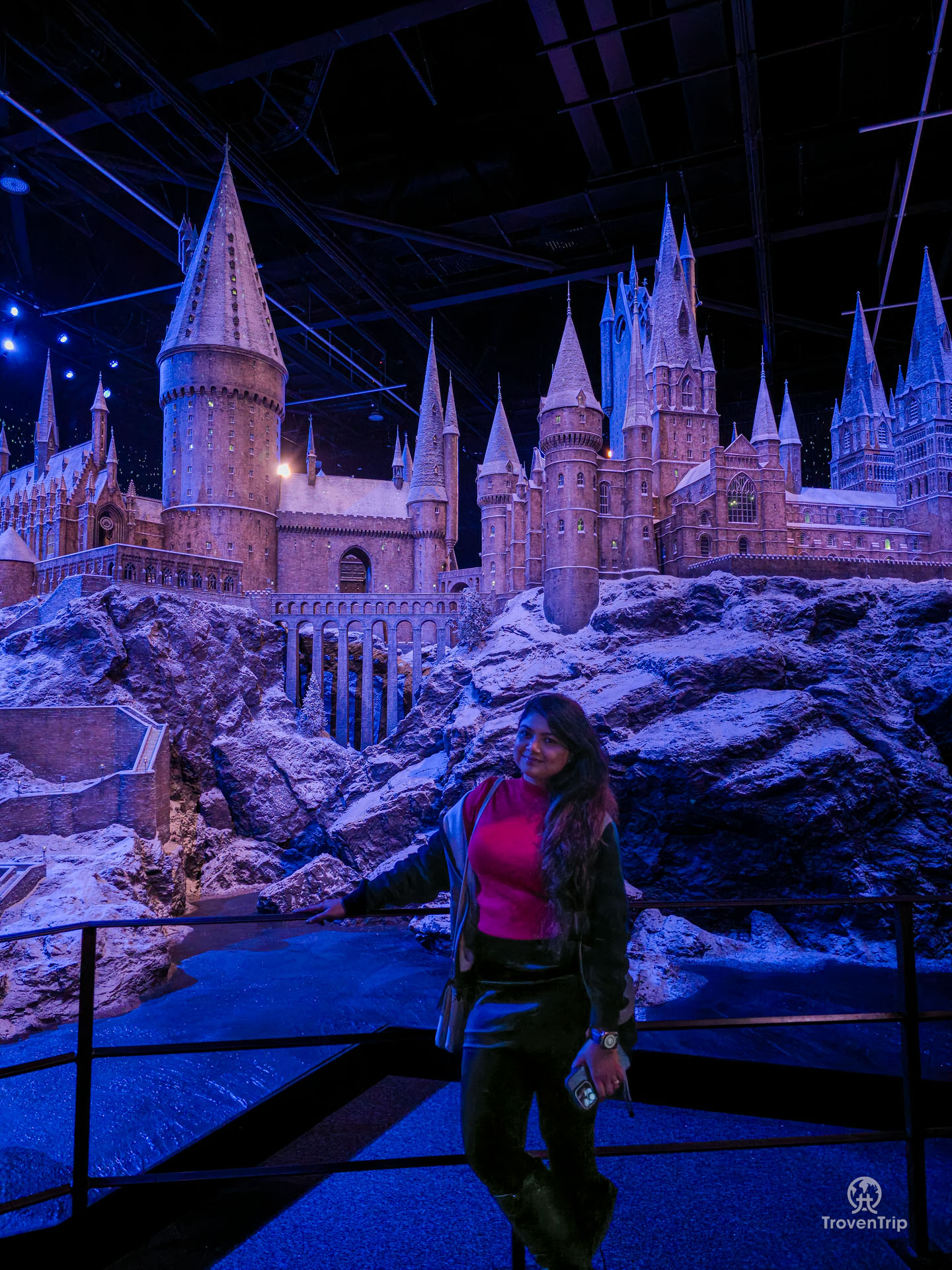 Sneha joins the line and gets a photo taken to begin with, before climbing onto a broom stick and flying through the streets of London to the Scottish countryside, all the way to Hogwarts!