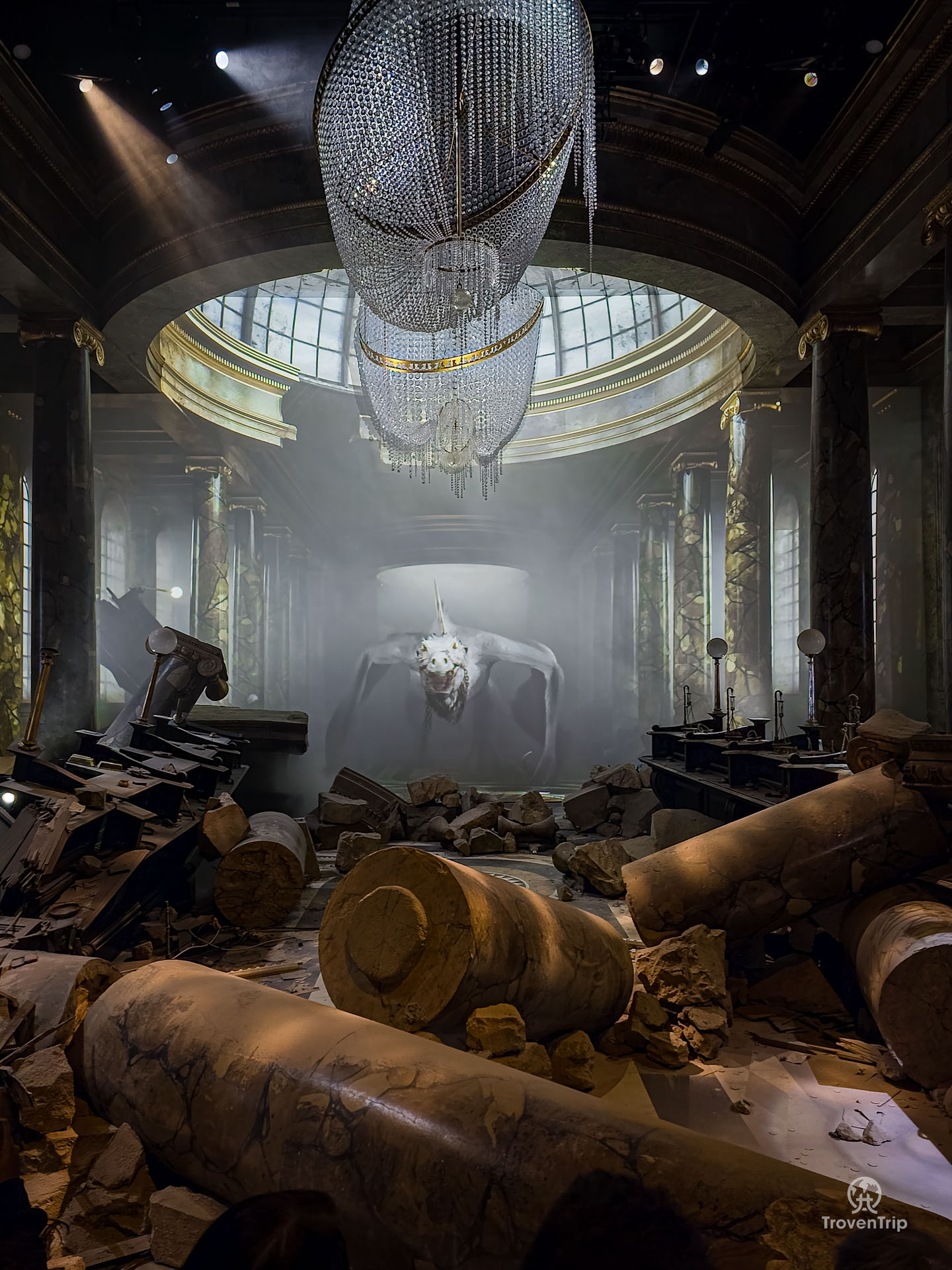 Further on in the special effects area, we also see the destruction of the Bank by a Ukrainian Ironbelly Dragon. The giant marble columns now lying broken on the ground, the huge chandeliers hanging off the ceiling, and the tellers desks collapsing as the Dragon fills the room with fire!
