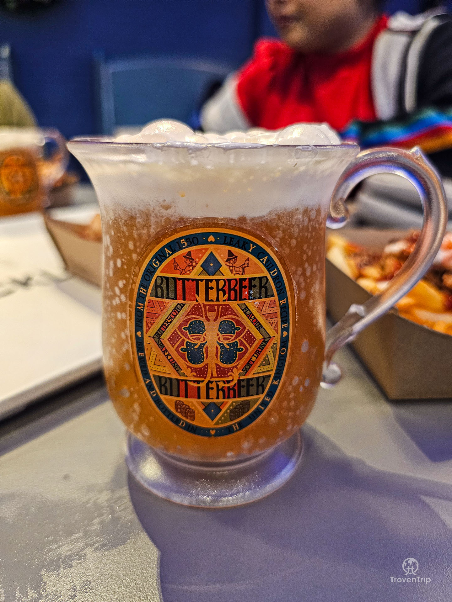Half-way around the tour is the Backlot Café. It's a good spot for lunch, serving hotdogs, festive chicken wings, and loaded fries. But the best part is we get Butterbeer!