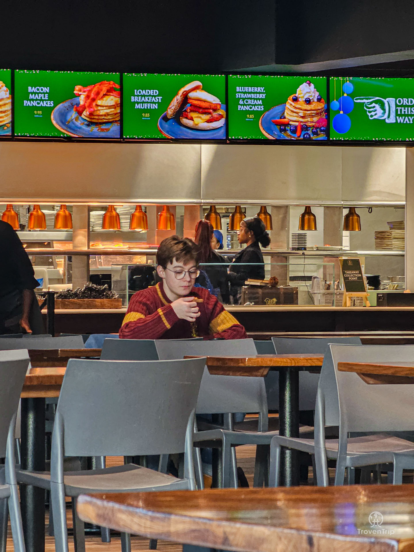 The cafés at the Harry Potter Studio Tour are surprisingly good! We started our day with breakfast in the main café, getting a breakfast muffin, with Paul getting a coffee from the same café but Sneha opting for one from the Starbucks stand there. And while eating breakfast, we also see Harry Potter himself enjoying breakfast!