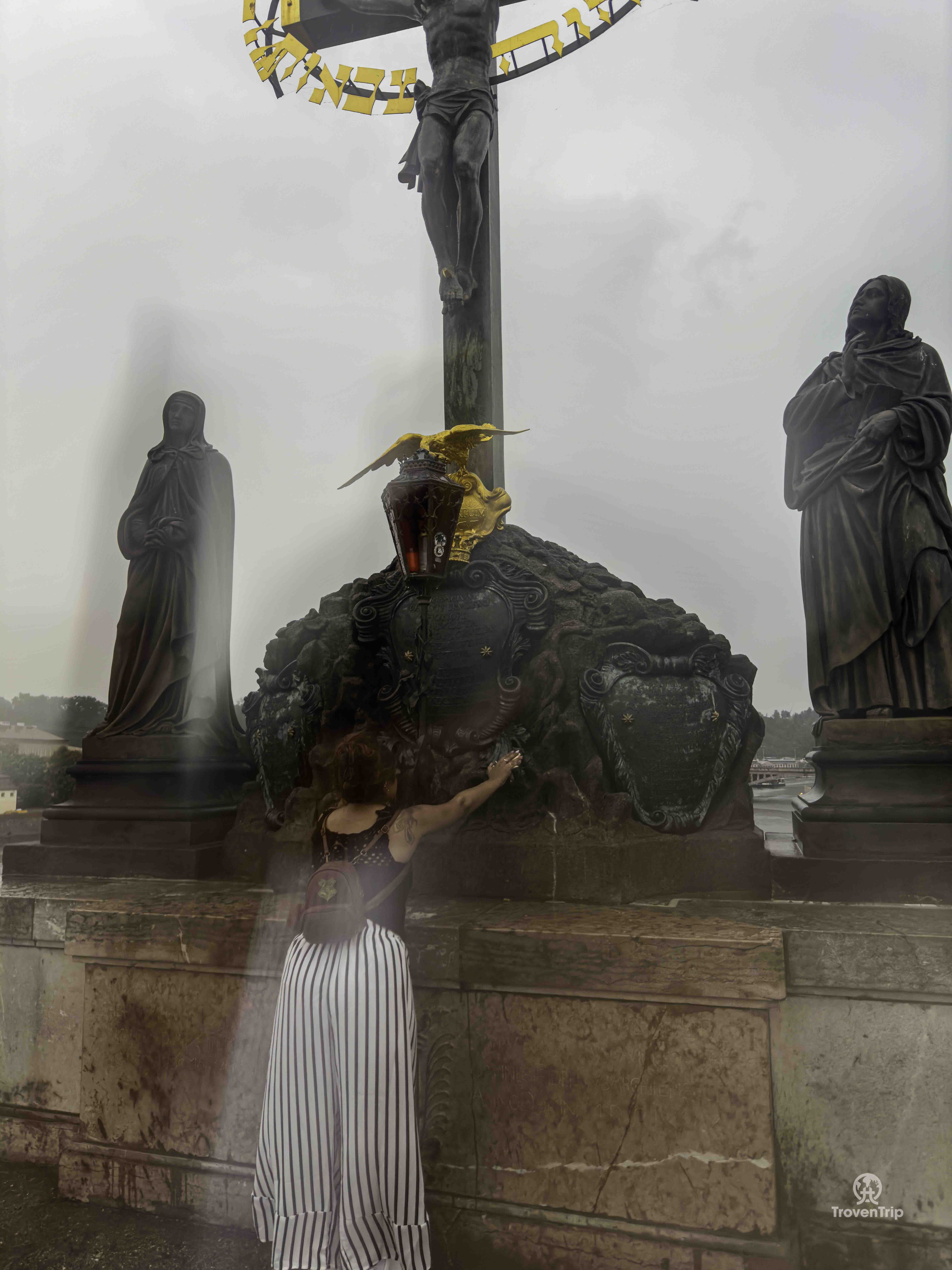 The bridge is lined by 30 statues. One of the most famous is St. John of Nepomuk, a Czech martyr and saint. He was thrown into the Vltava River from the bridge in 1393, and his statue is a popular stop for visitors. Touching the plaque beneath the statue is said to bring good luck.