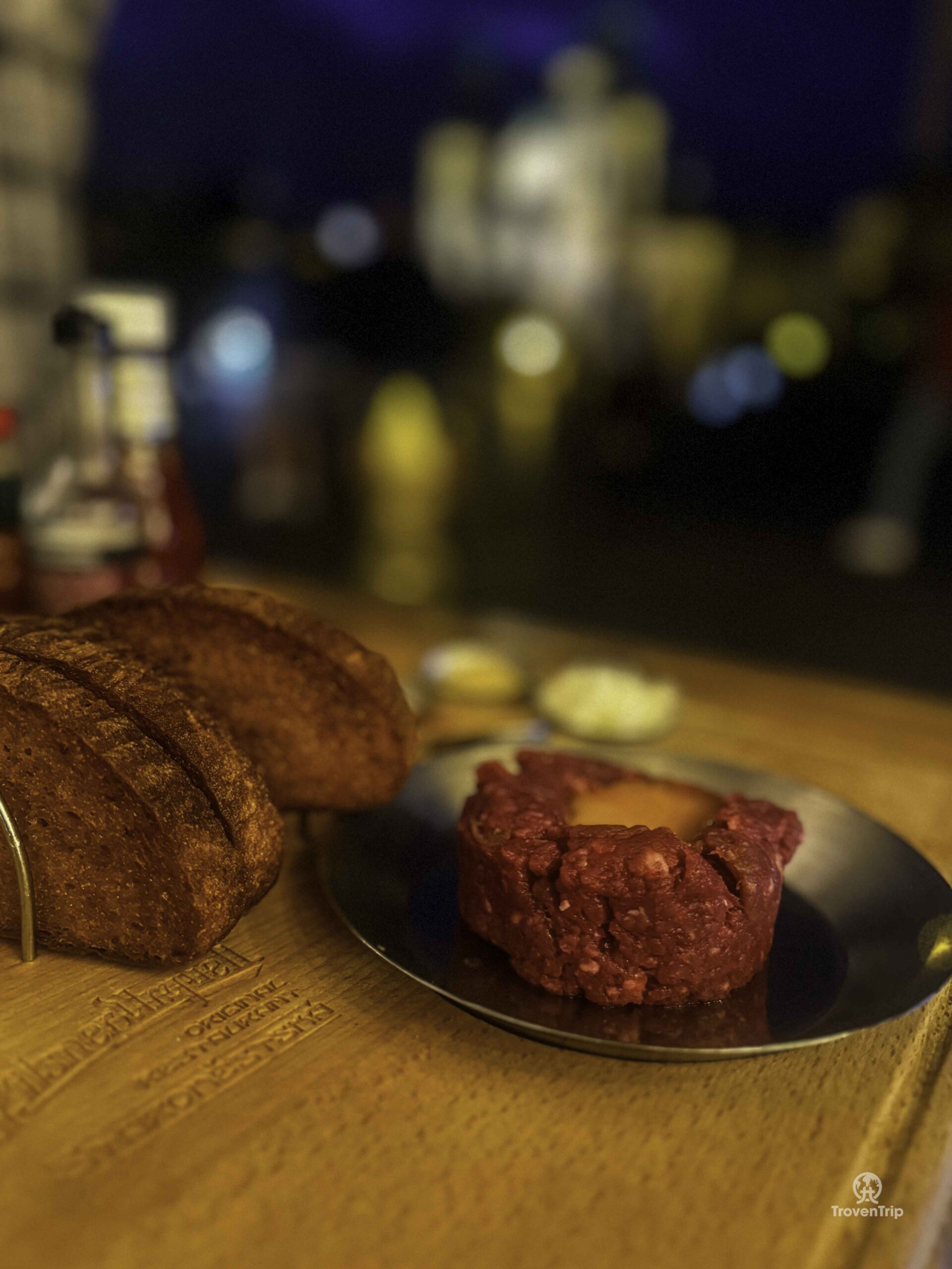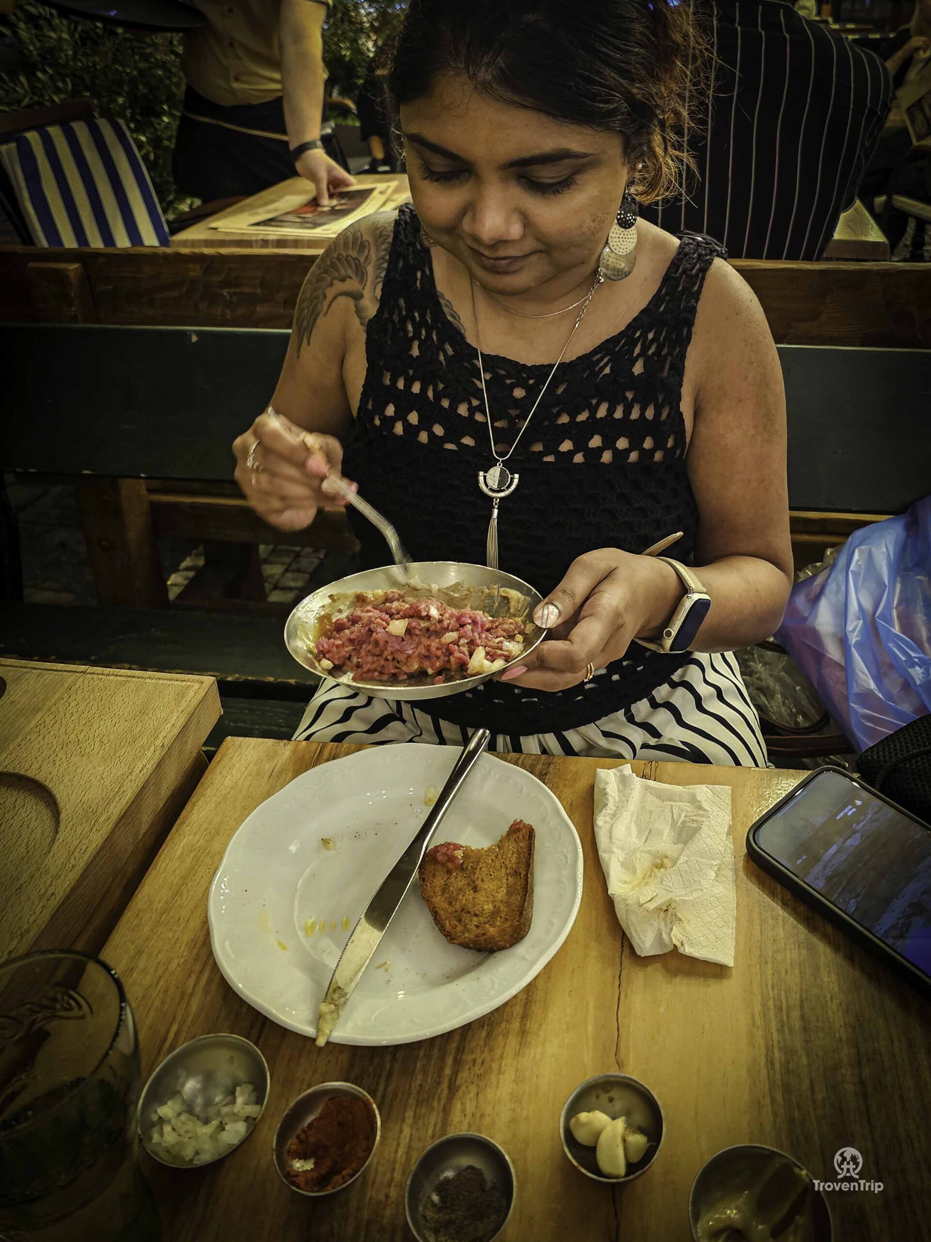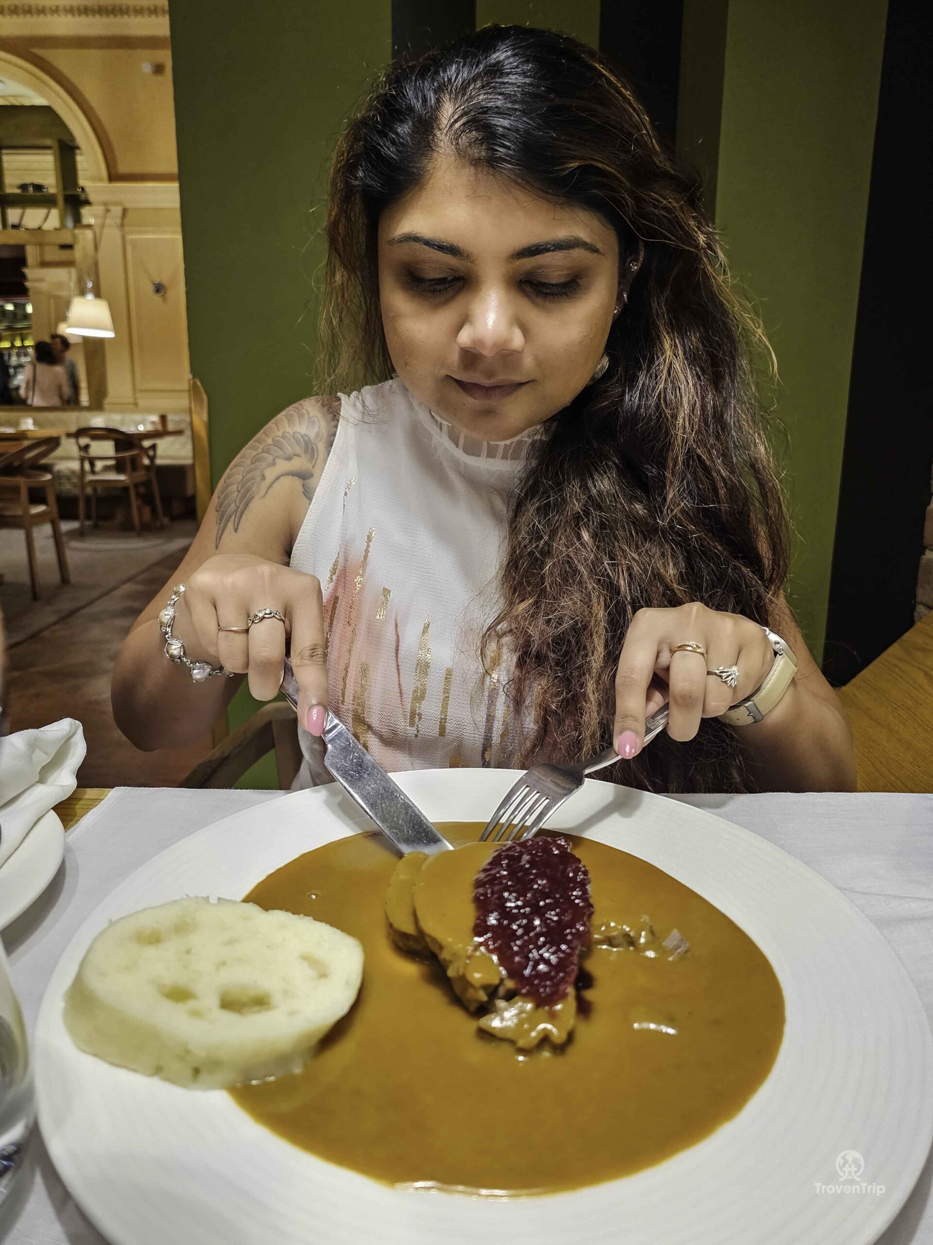 The steak beef tartar is a must try in Prague and so we shared that, with Sneha having to play chef and prepare it for us from all of the raw ingredients we got. And then we shared a roast duck leg which the portion size was huge on!