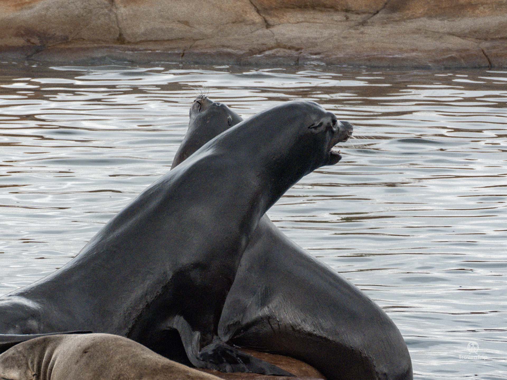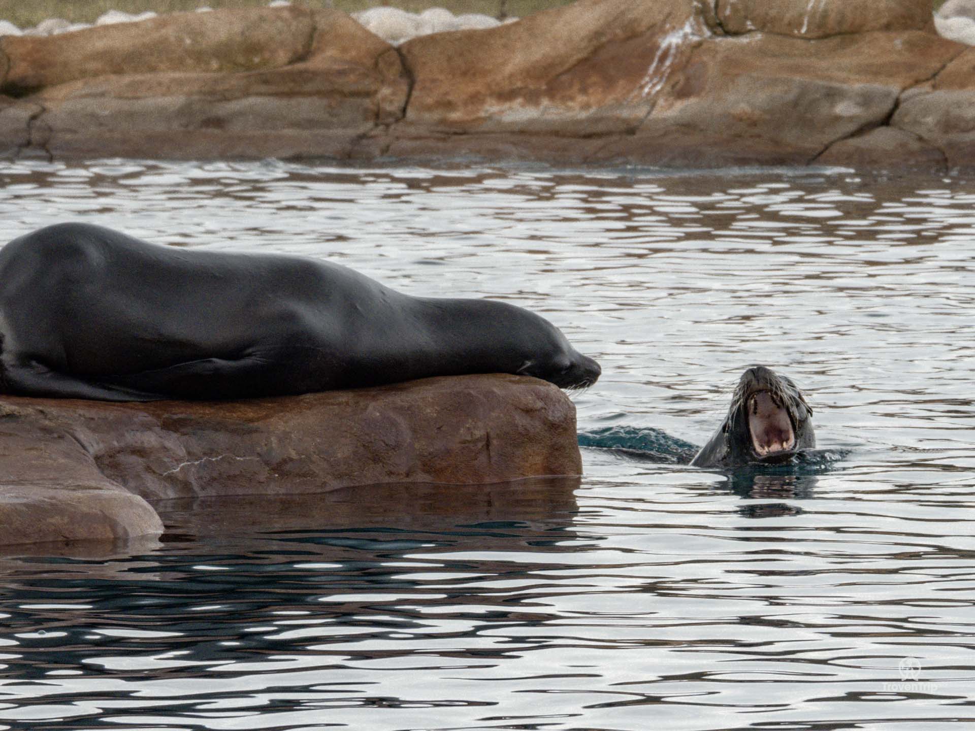 One sea lion in the water seems quite boisterous and playful, trying to get another to leave their island and join in… but they’re having none of it! A few growls and baring teeth suggests they don’t want to play… and Sneha comments that it reminds her of us with one wanting to have fun and the other being grumpy! (We’ll let you guess which way around that is) .