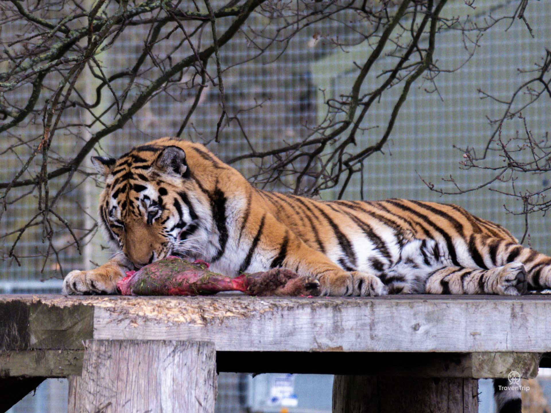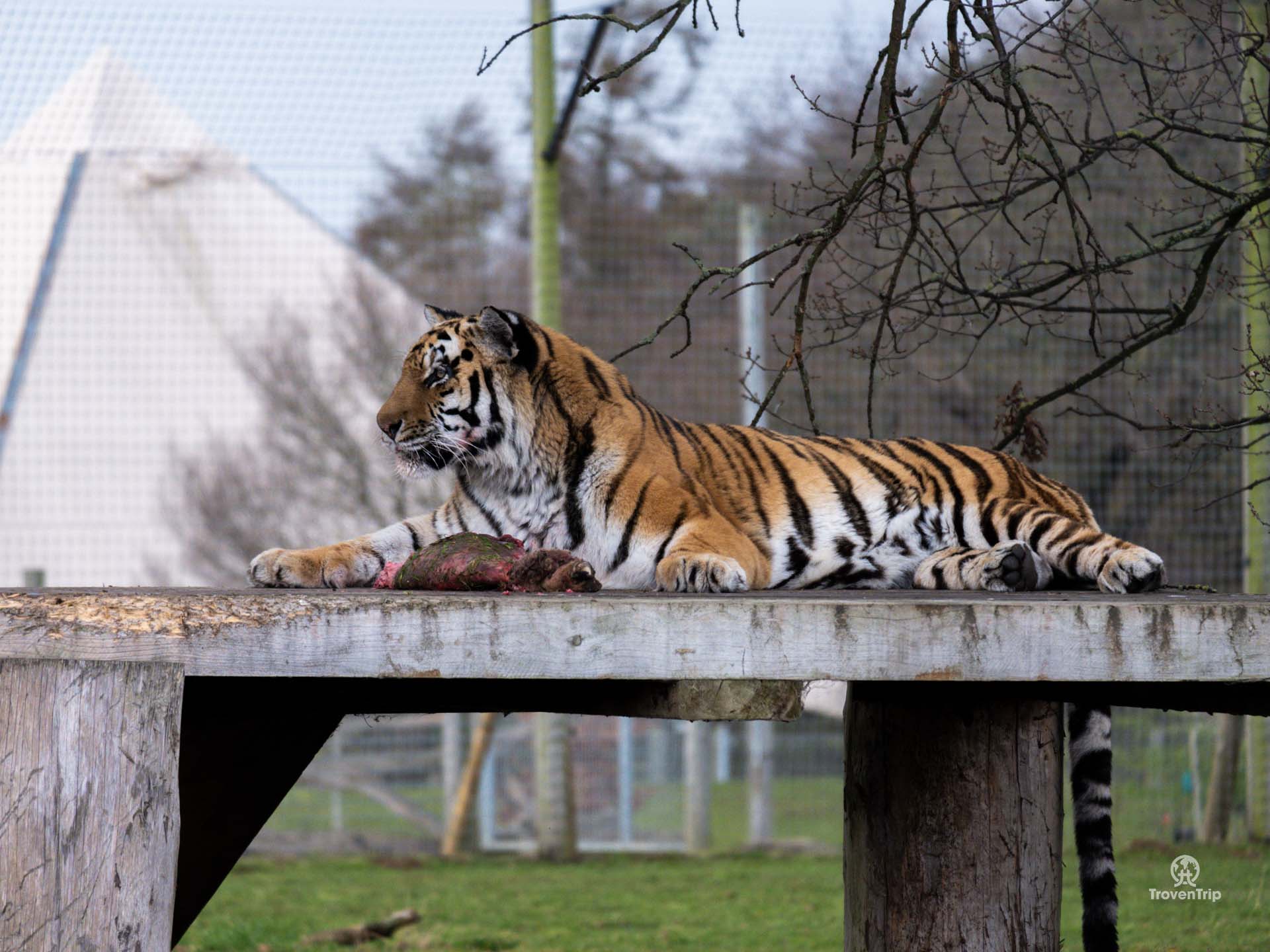The leg stinks, but as we walk around to the feeding platform it's a real sight to see to watch the tiger tear at the flesh with it's huge sharp teeth, before seeming to get bored and go back to stalking park visitors instead!