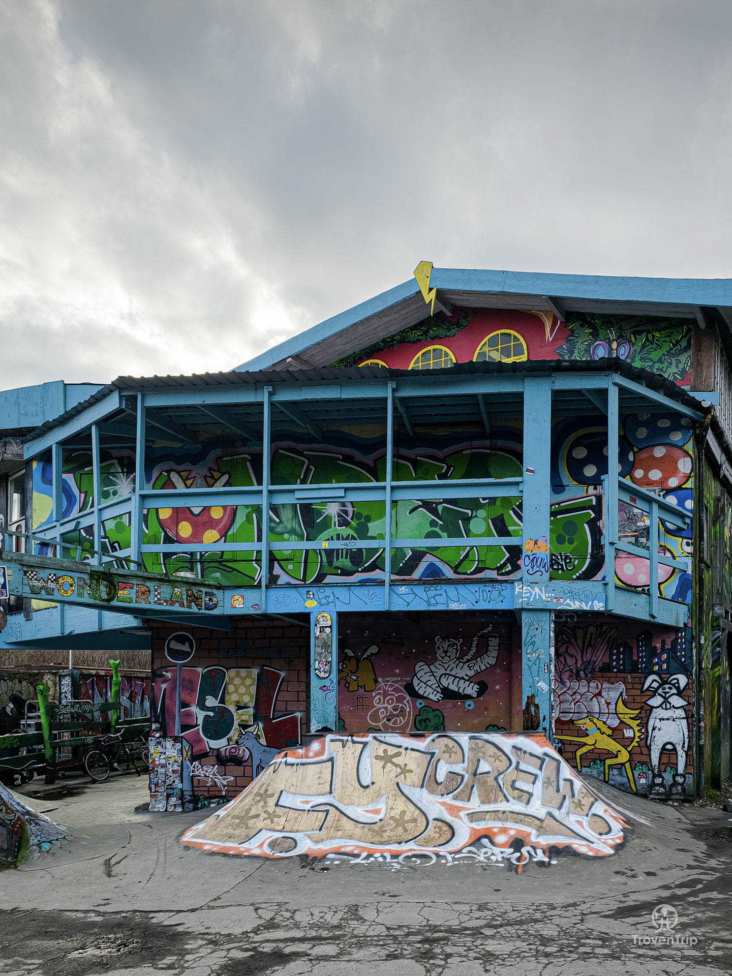 The artwork on the buildings is really cool. The first we see is covered by a large tree with fairies flying around. Another has an apocalyptic scene being guarded by a huge troll sculpture, labelled “The World is in our hands”. And others are covered in cartoon characters, and lots and lots of graffiti.