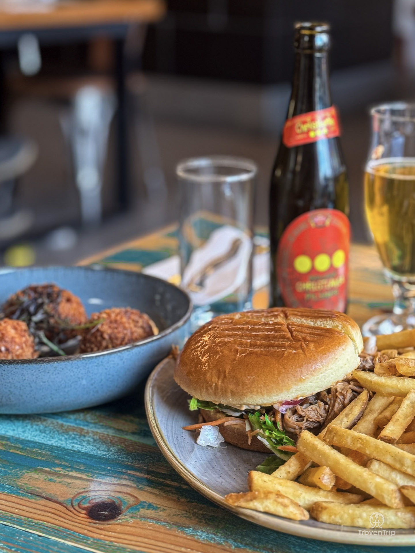On the specials is a pulled pork burger, and we’re pleased with our change of mind as the burger is really good. But not quite as good as the risotto balls (at least Paul thinks so anyway), which are delicious!