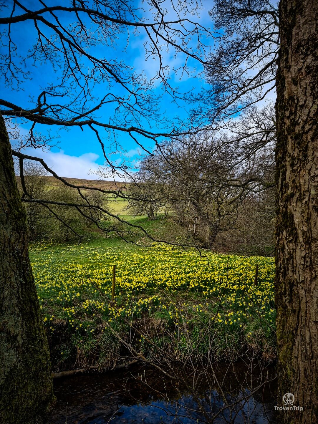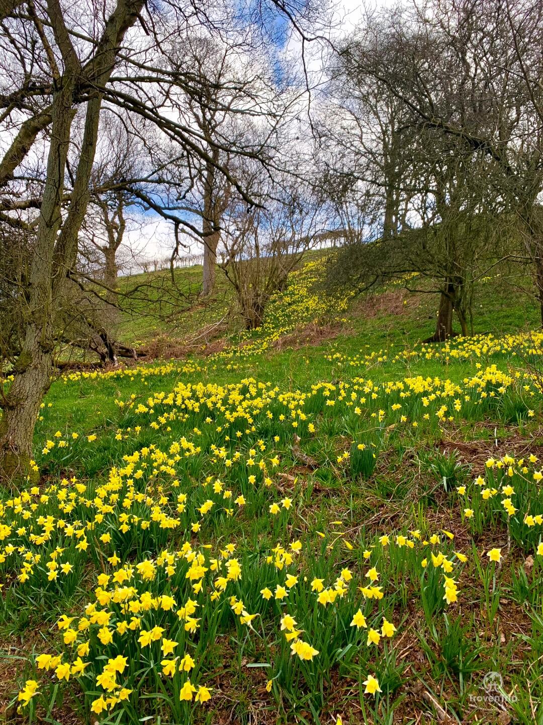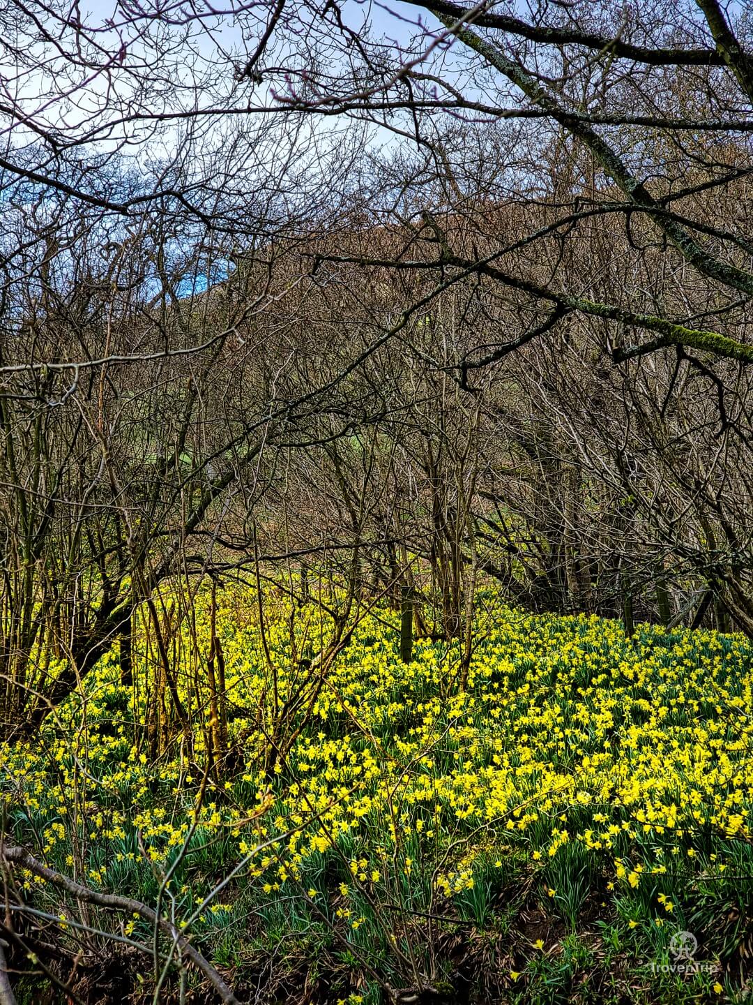 - Just after the Daffy Caffy and crossing the river, rather than continue straight into the field ahead, double back and follow the river for a few minutes through the daffodils. This then gives you great views when you climb uphill and head to join back up with the path
