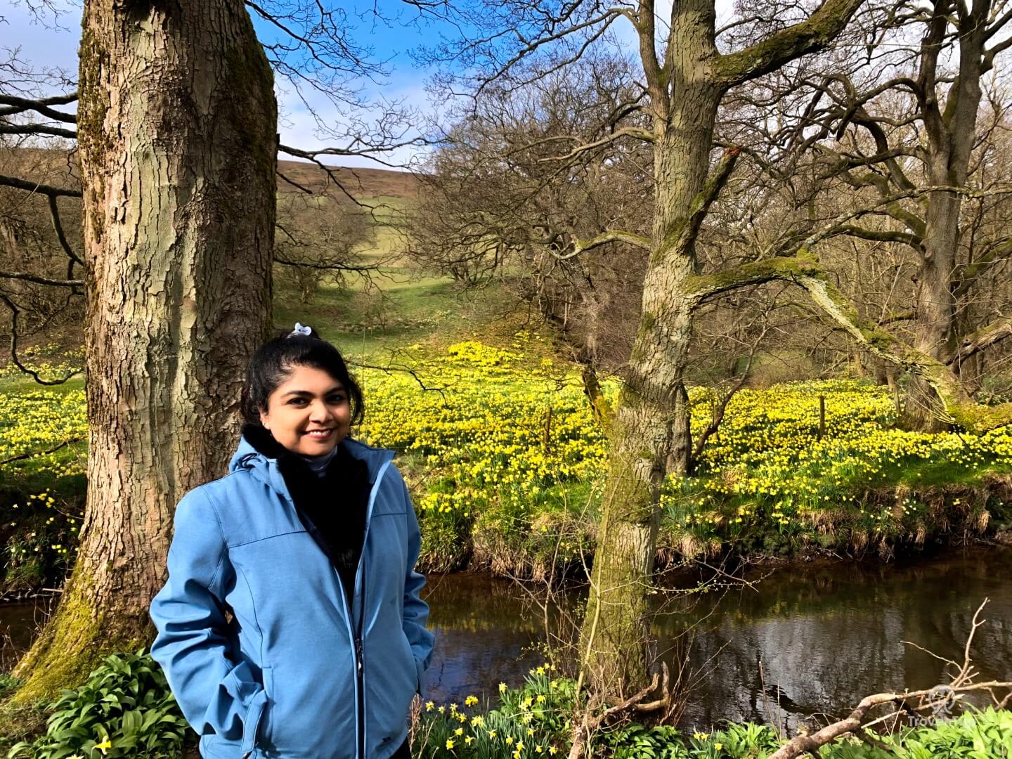 The view of Daffodil Valley from the hilltop is stunning as we can see the daffodils at far off distances, crowded below the trees and they all look like yellow pebbles shimmering in the sunrays. Sneha is thrilled to see the place as it’s the first time ever she is seeing thousands and thousands of daffodils together in real life.