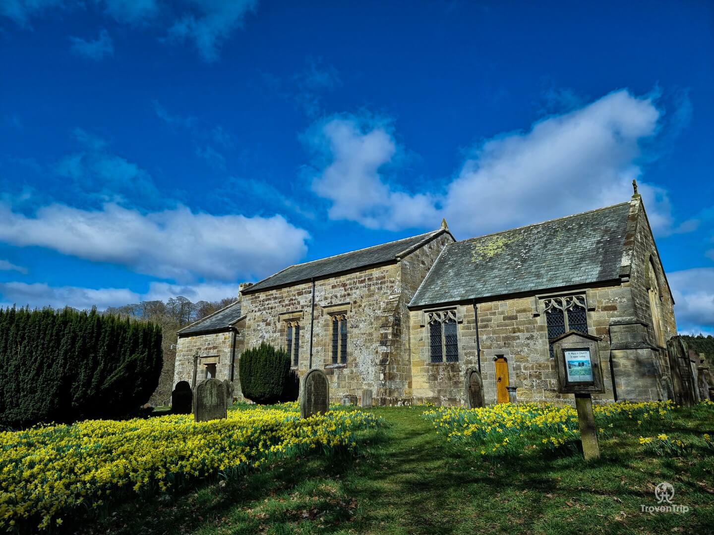 We now decide to continue with our adventure to few areas near to the Daffodil Valley… we head towards Church Houses, pass the Feversham Arms (which is unfortunately closed due to Covid restrictions), and stop for a while at the Church of St Mary. This is the furthest point of our walk, so we cut back across the farmers’ fields and make our way back to the car park, trying not to disturb the sheep and their lambs as we go.